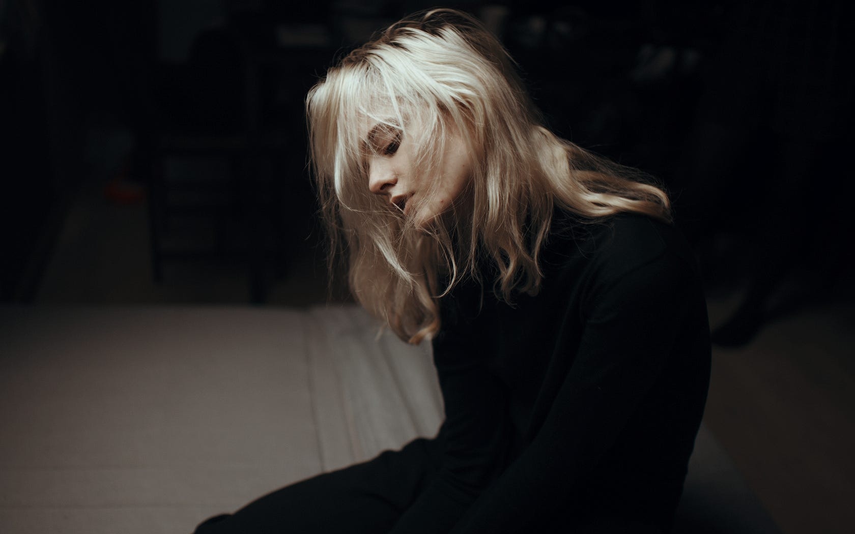 Description: A woman sitting on a bed with her eyes closed and her hair blowing in the wind.