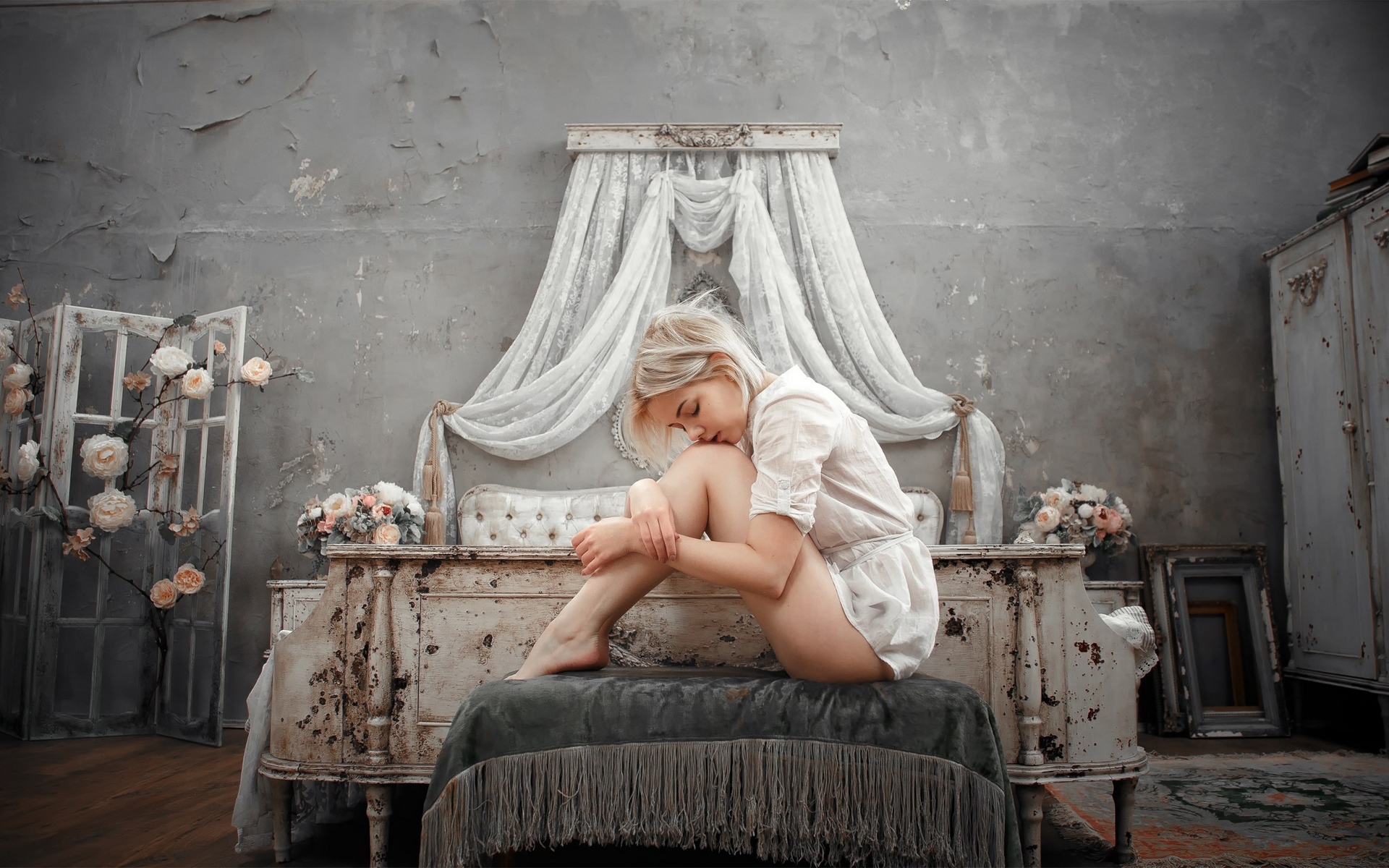 Description: A woman sitting on a bed in a room with a curtain and a chair with a fringe on it.