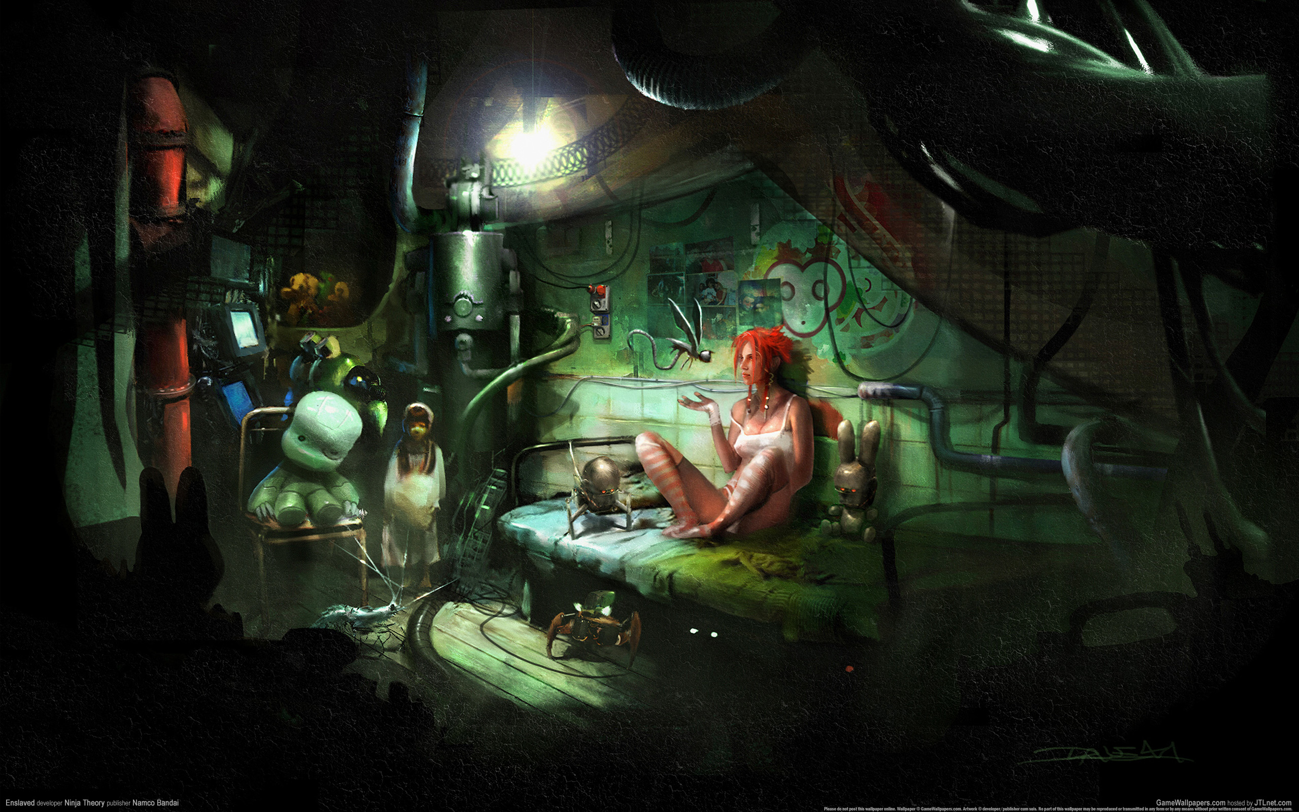 Description: A woman sitting on a bed in a room with a lot of stuff on the walls and floor and a lamp on.
