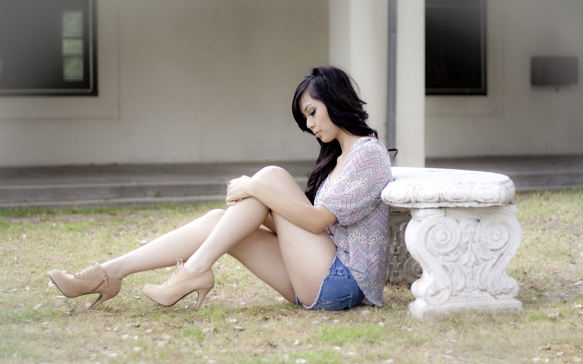 Description: A woman sitting on a bench in front of a building with her legs crossed and her legs crossed.