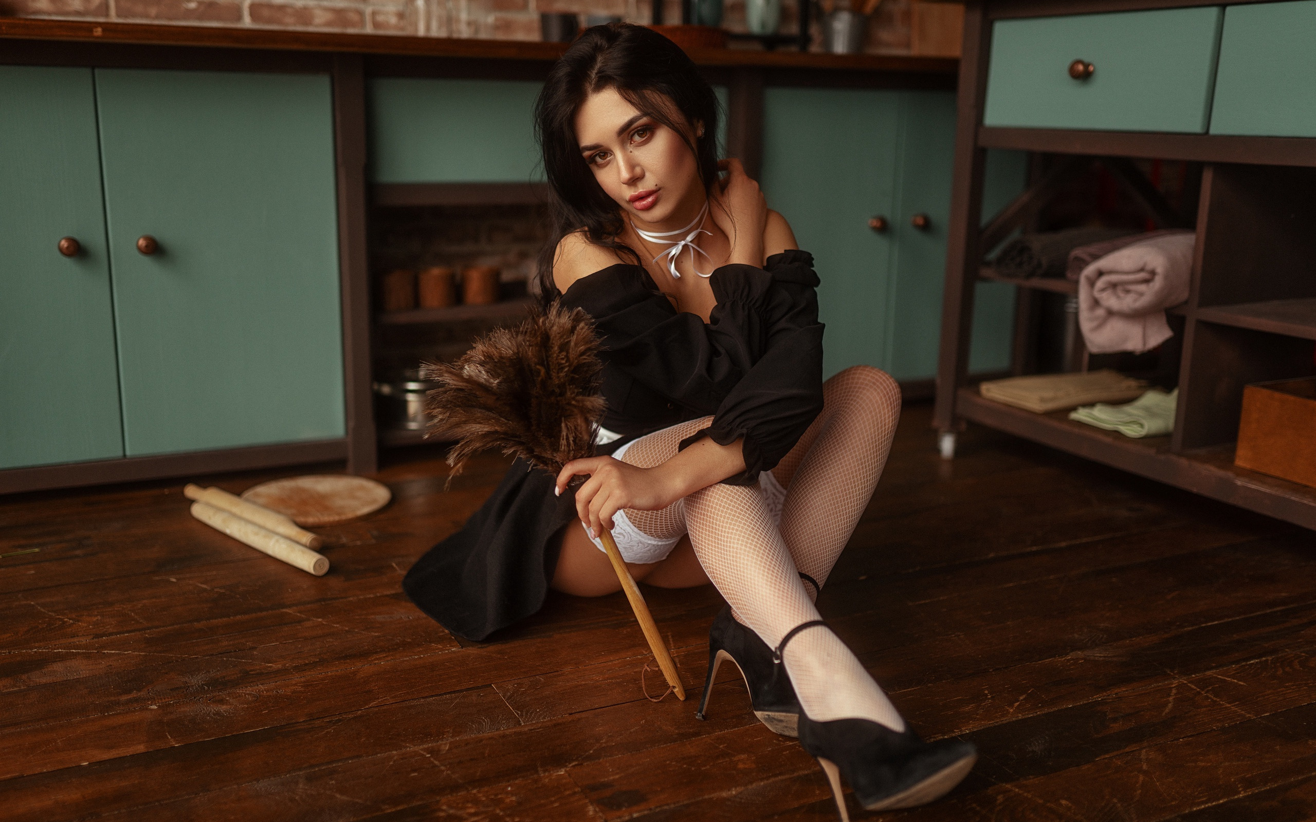 Description: A woman sitting on the floor with a broom in her hand and a hat in her other hand.