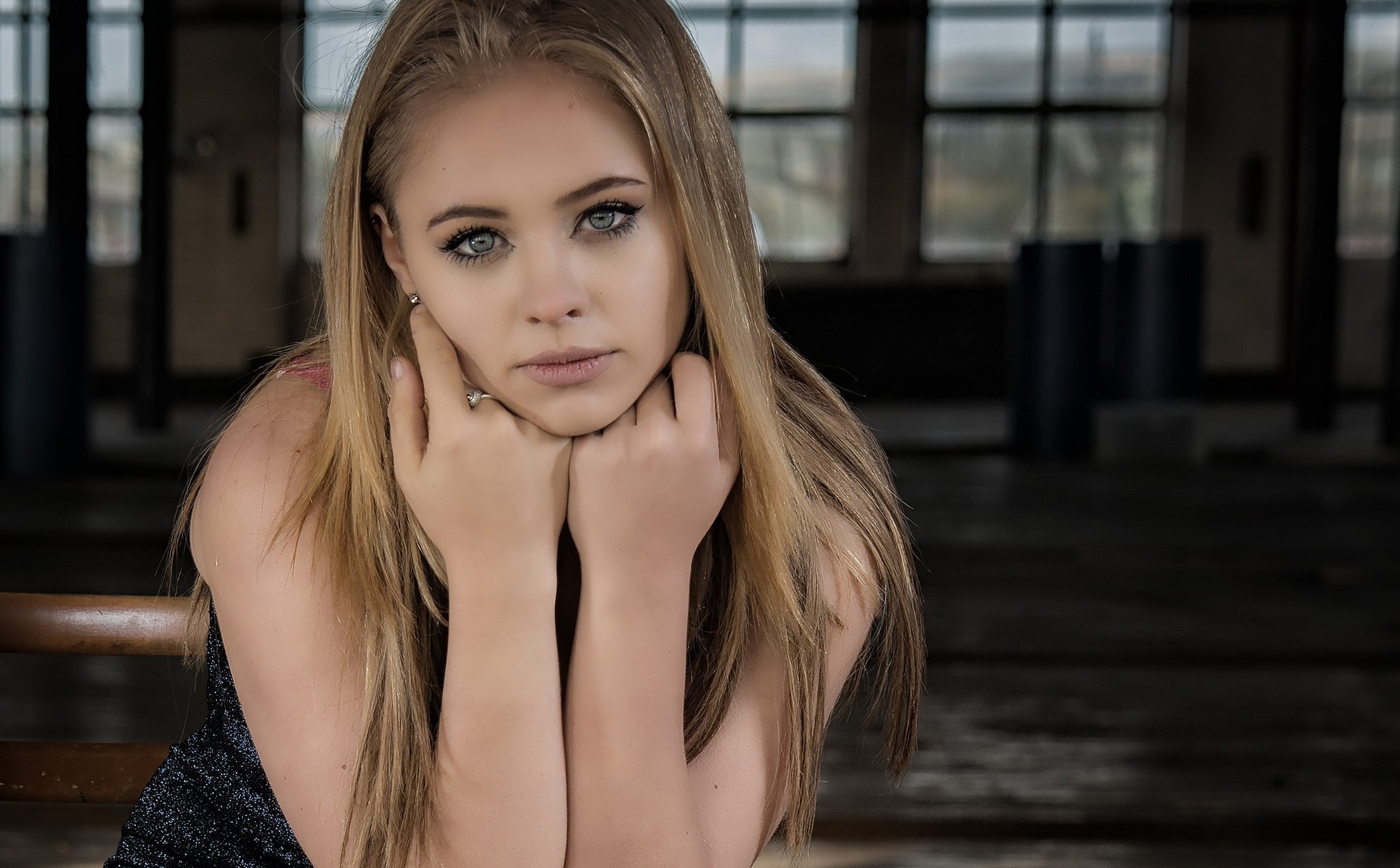 Description: A woman sitting on a chair with her hands on her face and her hand on her chin.
