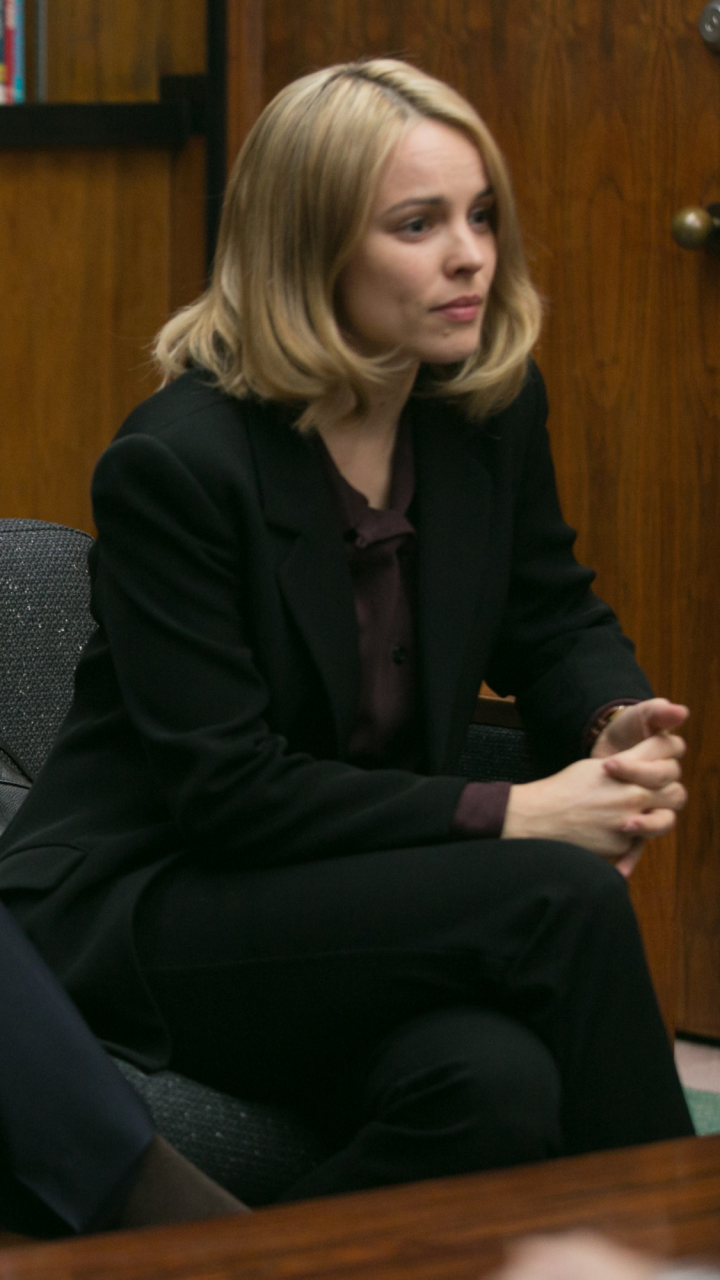 Description: A woman sitting in a chair with her hands folded out in front of her face and a man standing behind her.