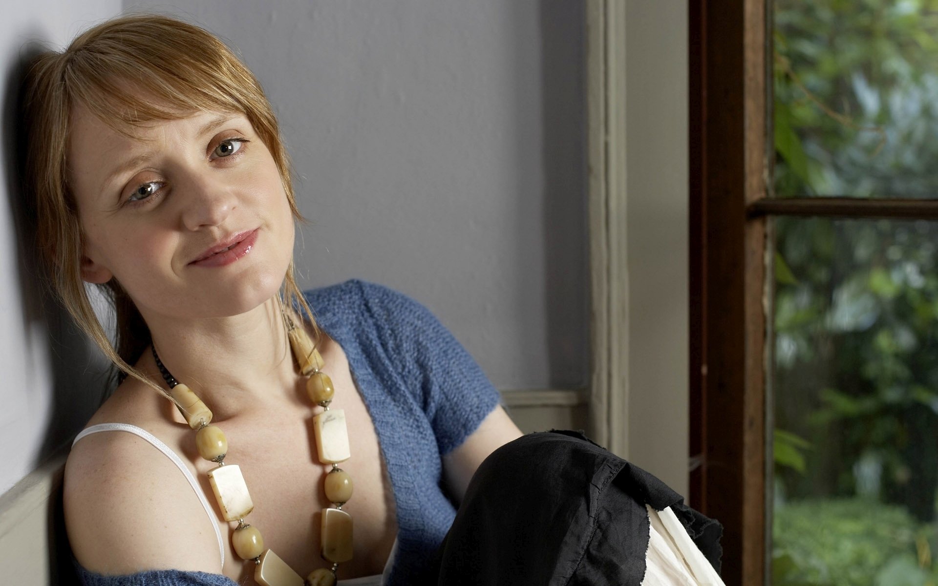 Description: A woman sitting in a chair with a necklace on her neck and a handbag on her shoulder.