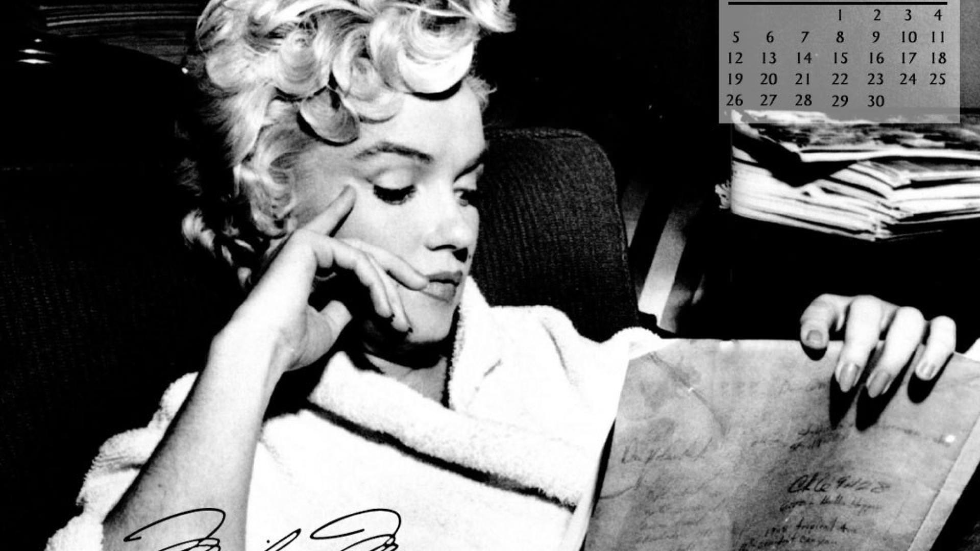 Description: A woman sitting in a chair reading a book with a calendar on the wall behind her and a calendar on the wall behind her.