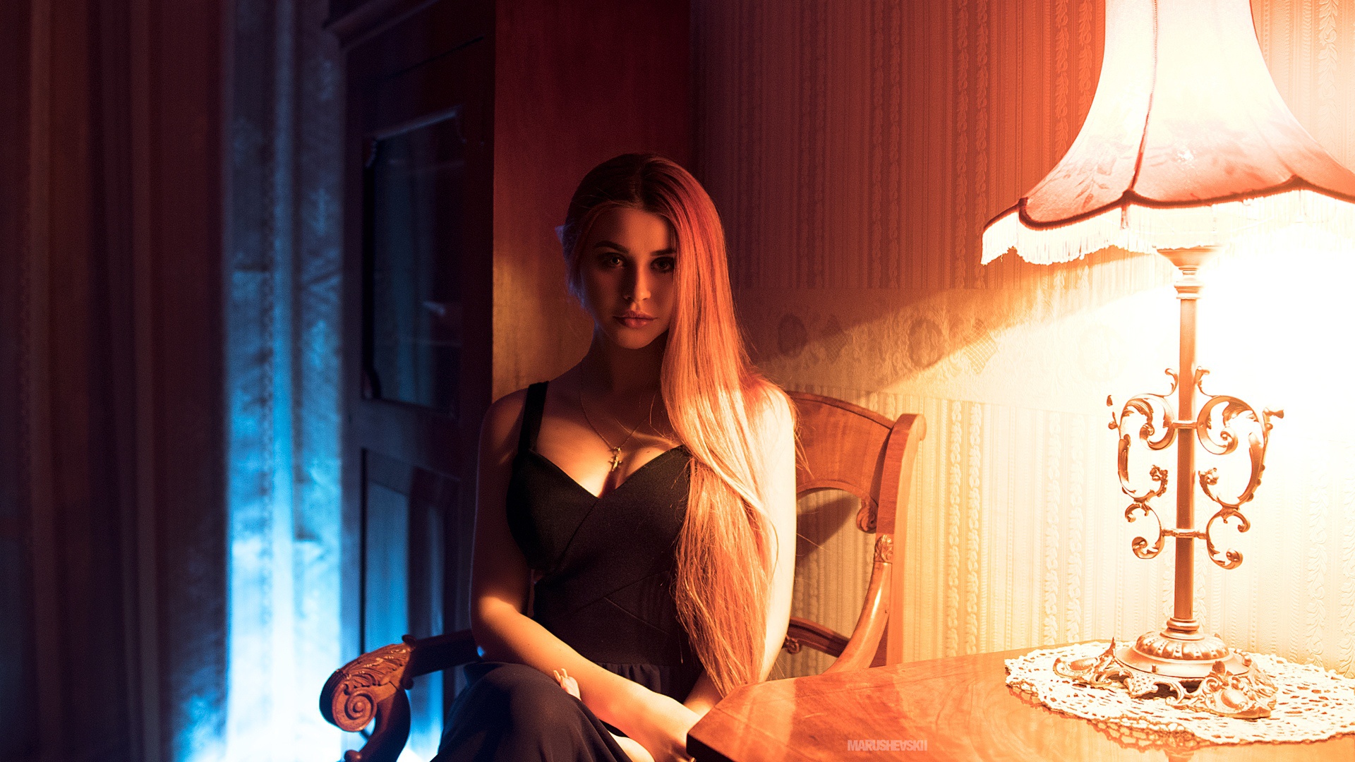 Description: A woman sitting on a chair in a room with a lamp on the side of the table and a lamp on the side table.