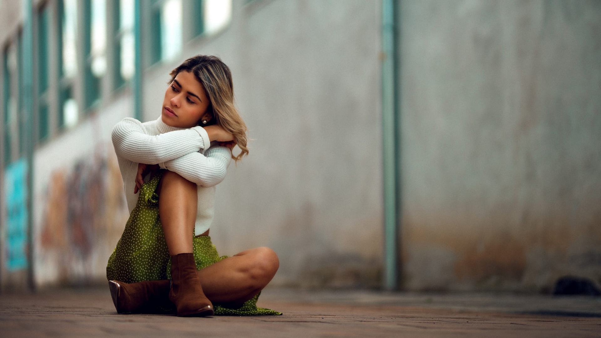 Description: A woman sitting on the ground with her arms crossed and looking away from the camera.