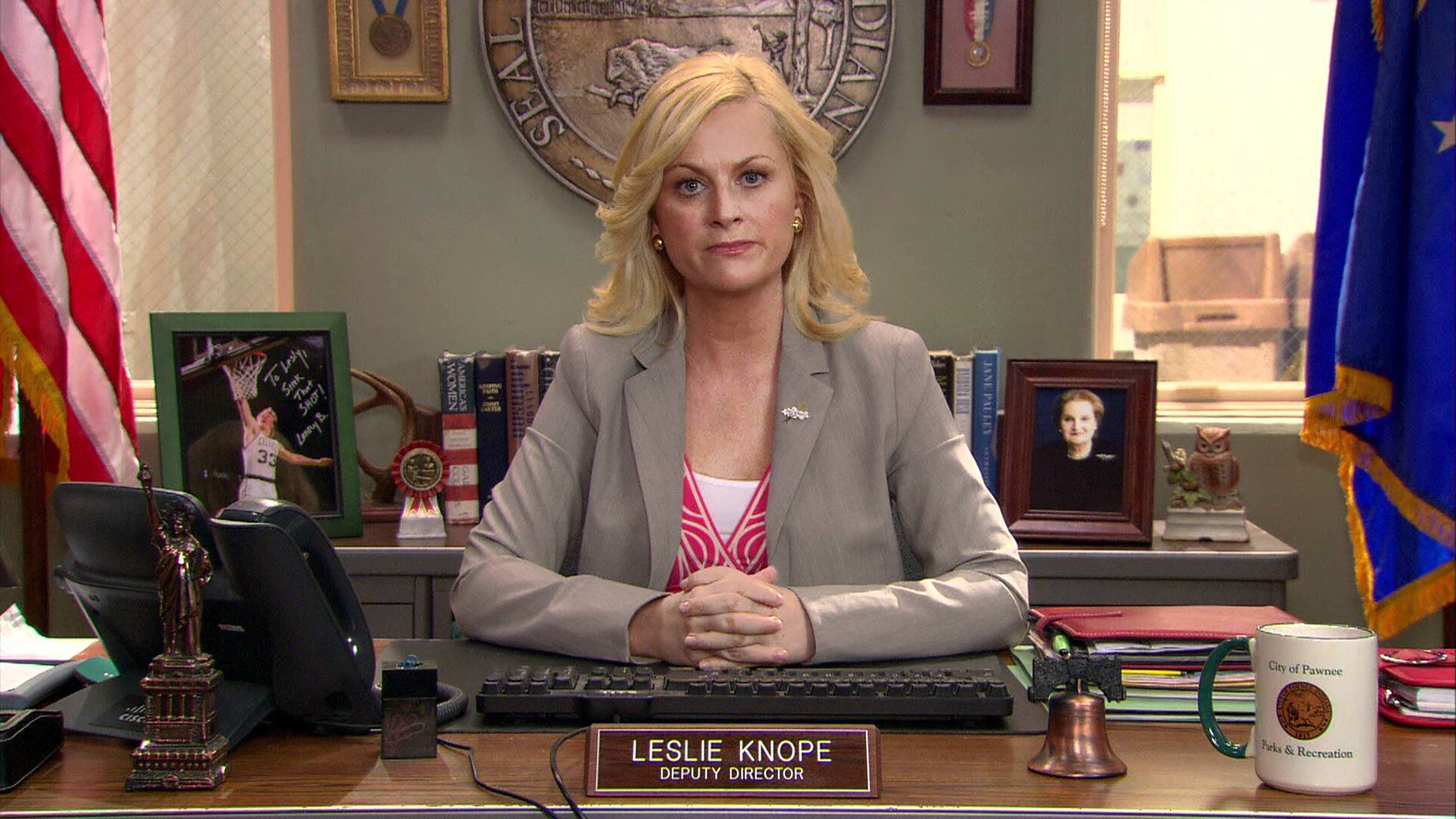 Description: A woman sitting at a desk with a computer and a flag behind her on the desk is a plaque that reads lesle kref.
