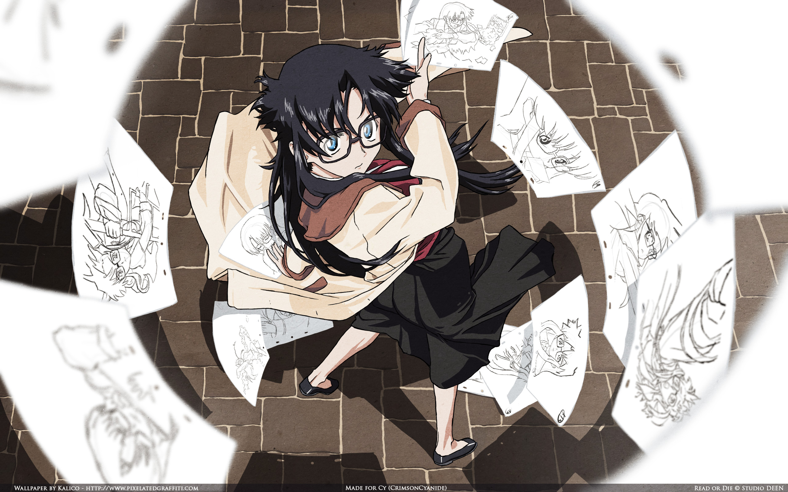 Description: A woman sitting on a floor with a bunch of drawings around her and a clock in the background with a person standing on the floor.