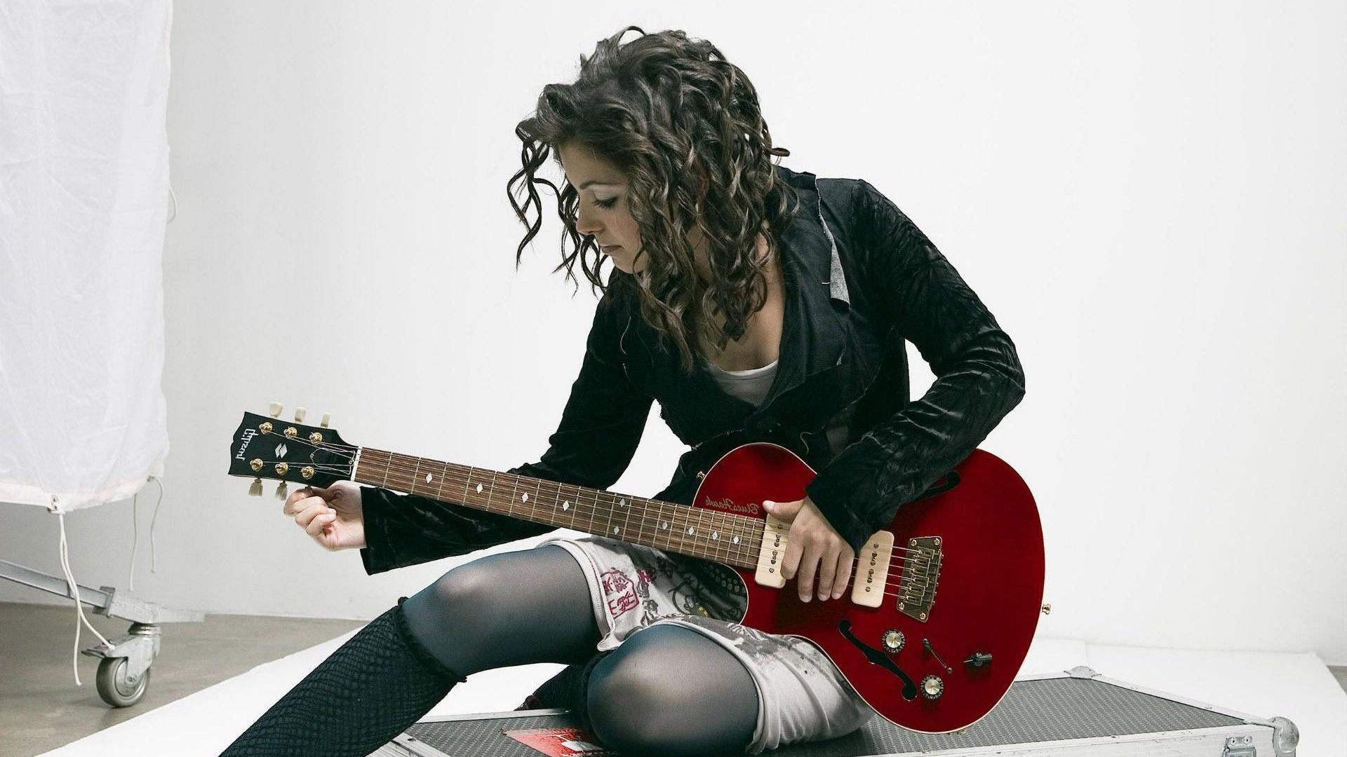 Description: A woman sitting on a floor with a red guitar in her hand and a white background behind her is a white backdrop.