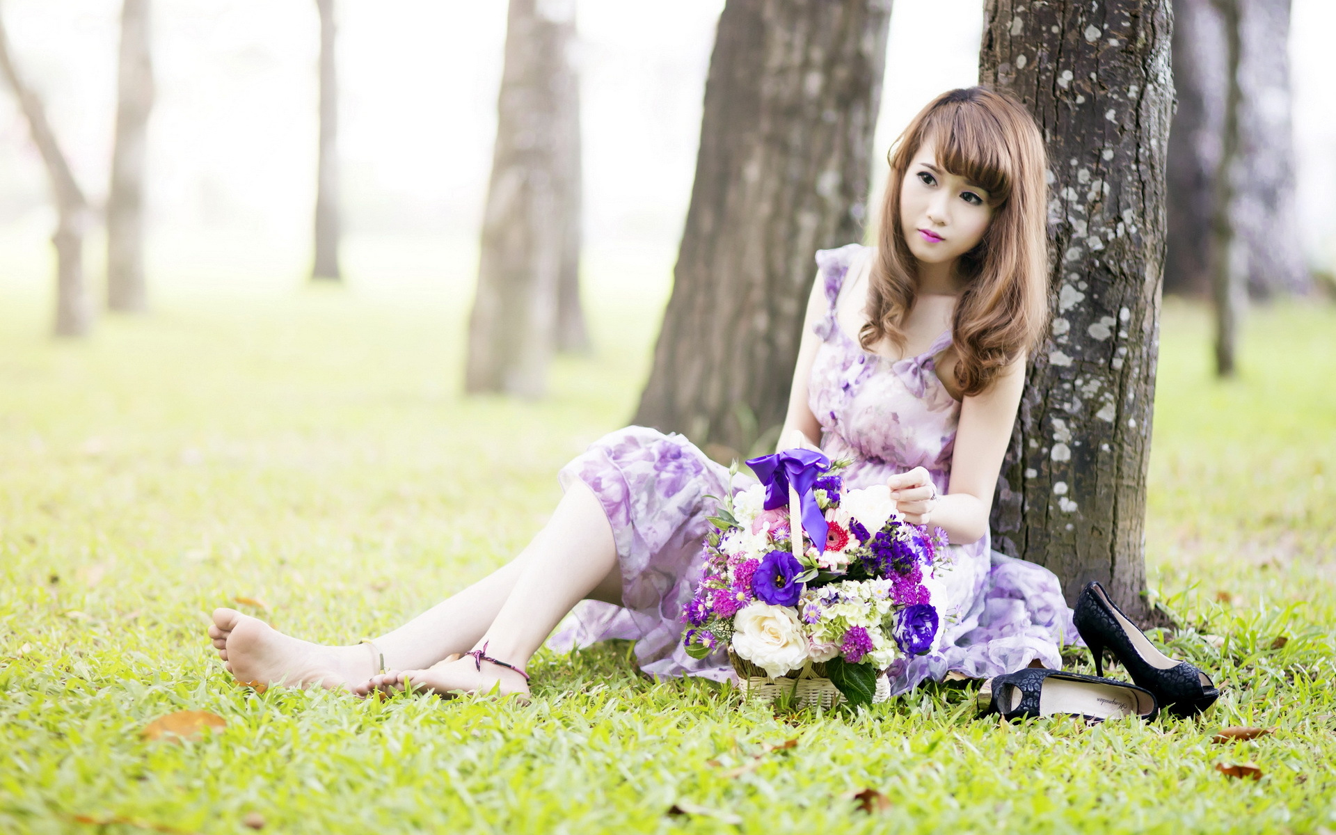 Description: A woman sitting in the grass with a bouquet of flowers in her hand and a book in her lap.
