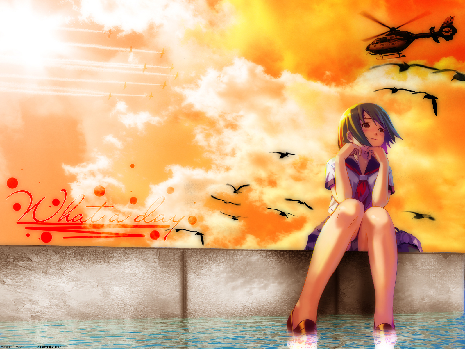 Description: A woman sitting on a ledge in front of a painting of birds and a sunset with a helicopter flying over her.
