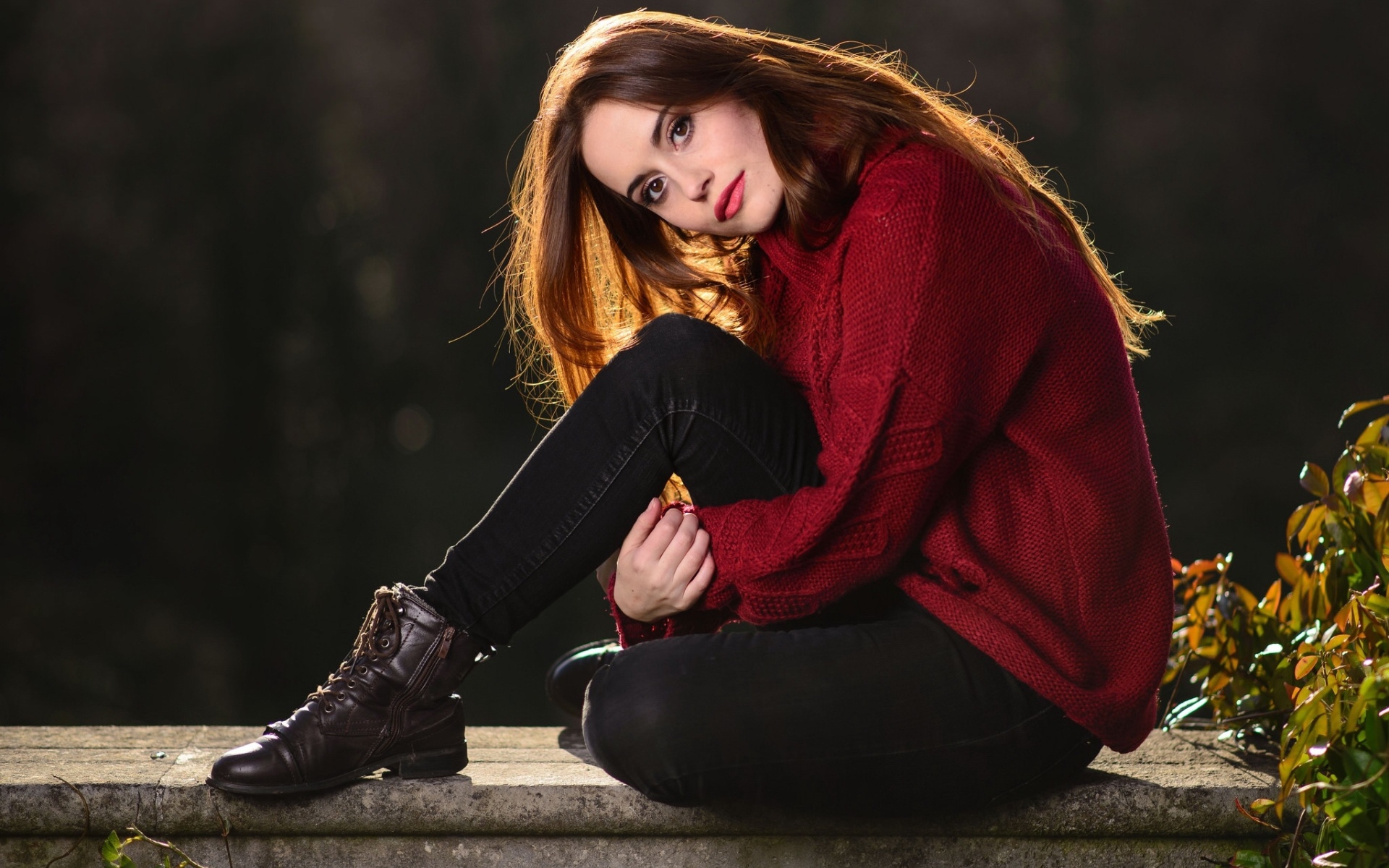 Description: A woman sitting on a ledge with her legs crossed and her head resting on her hands.
