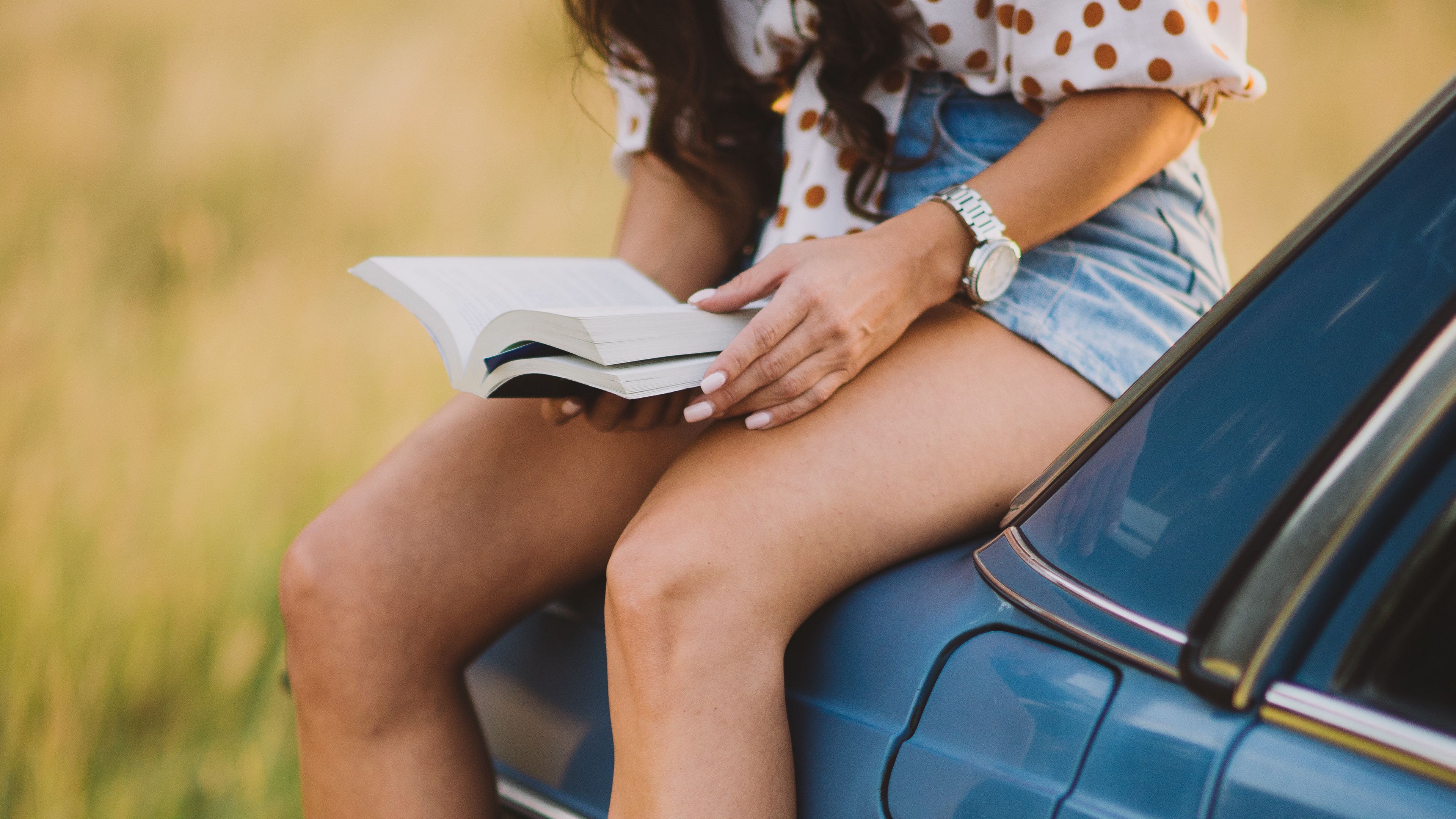 Description: A woman sitting on the back of a car reading a book while holding a book in her hand and leaning on the car.