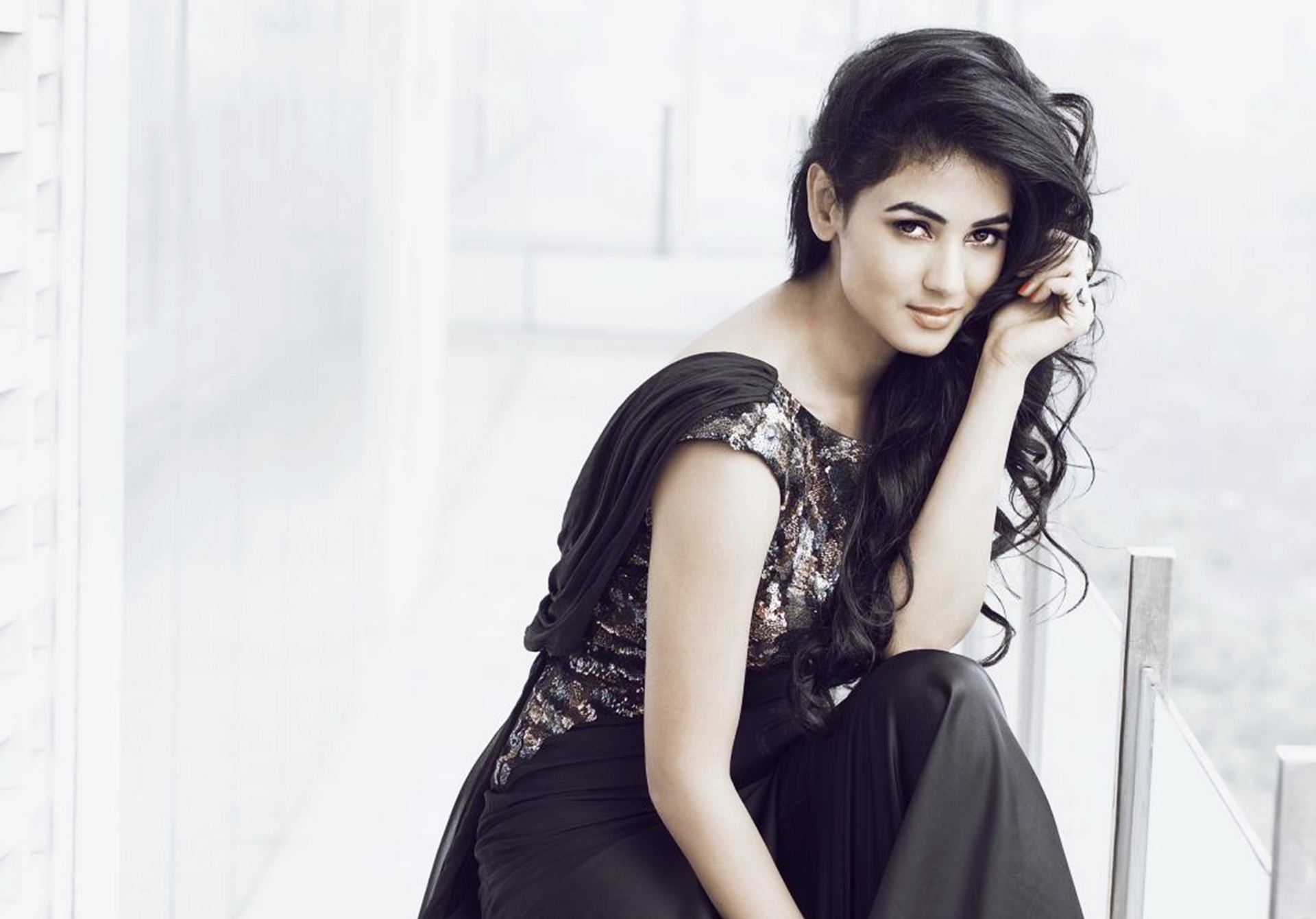 Description: A woman sitting on a ledge in a room with a window behind her and a hand on her head.