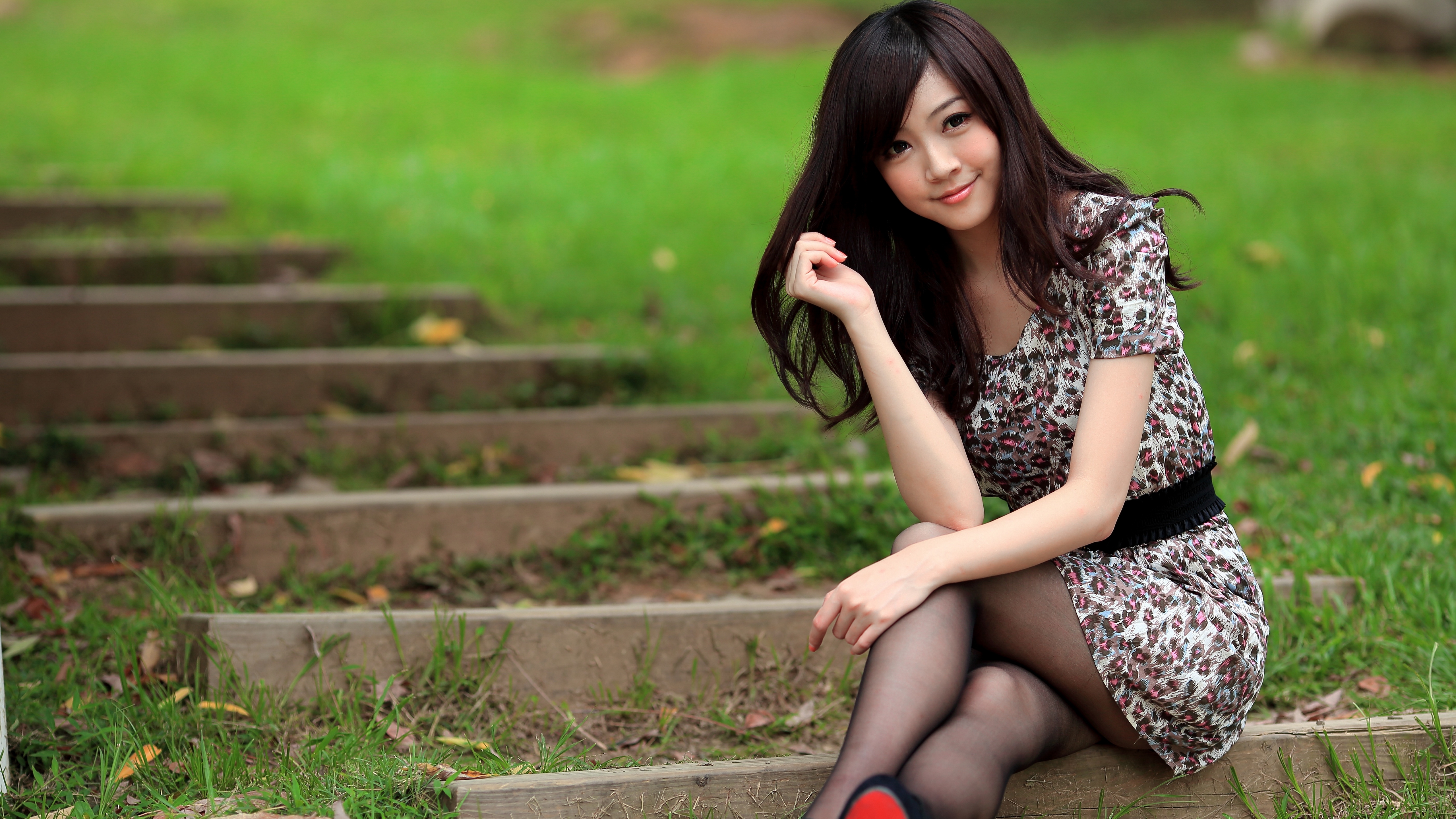 Description: A woman sitting on steps in a park with her legs crossed and her hand on her chin.