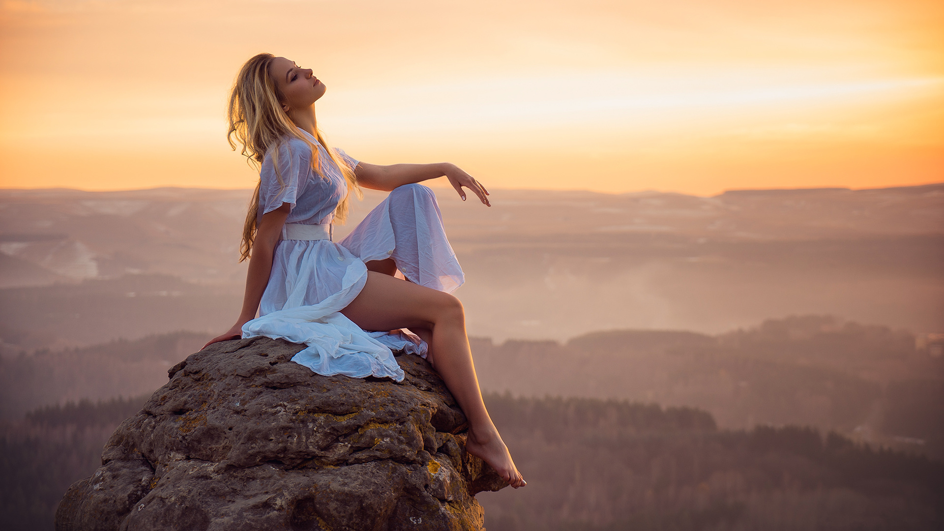 Description: A woman sitting on top of a rock with her legs crossed and her legs crossed.