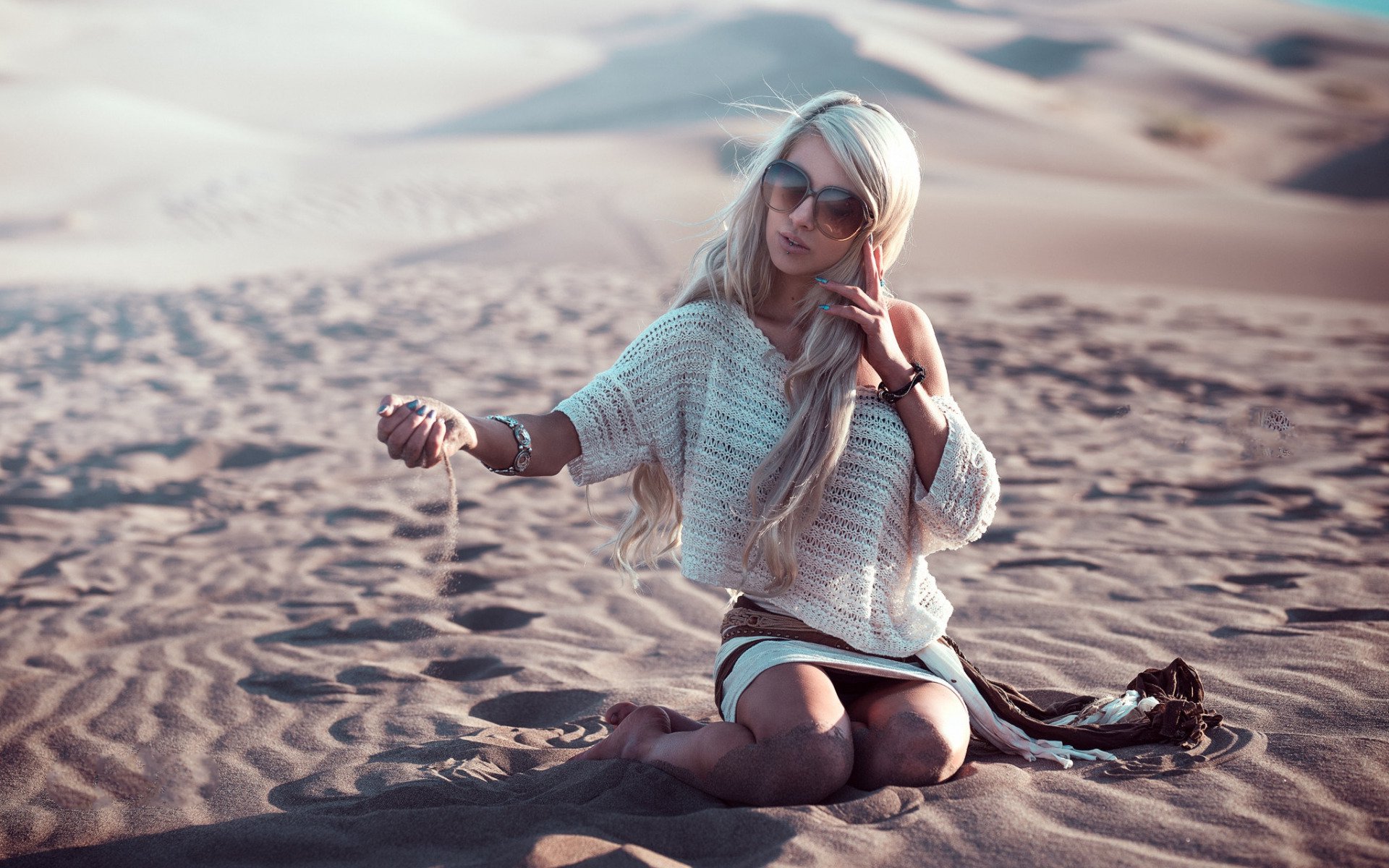 Description: A woman sitting on the sand with her hand on her ear and a cell phone in her hand.