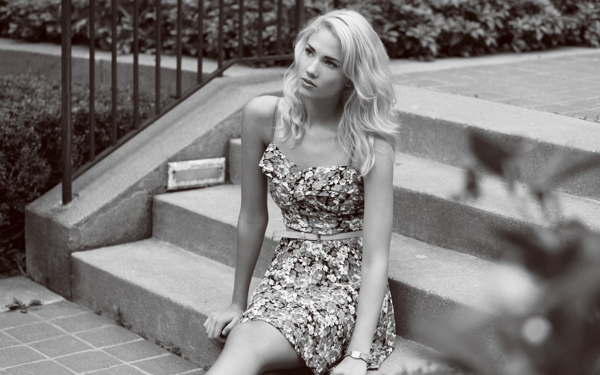 Description: A woman sitting on a step next to a plant and stairs with a handbag on her lap and a purse on her lap.
