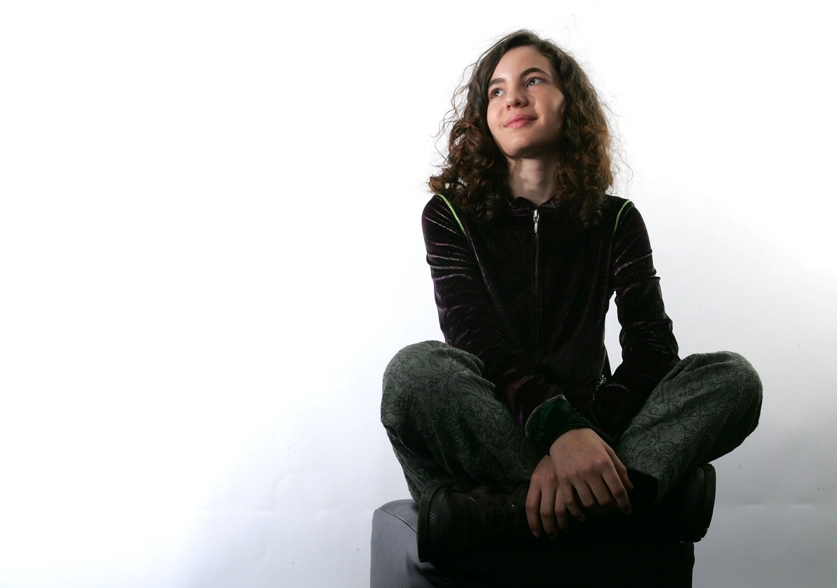Description: A woman sitting on a stool with her legs crossed and her eyes closed.