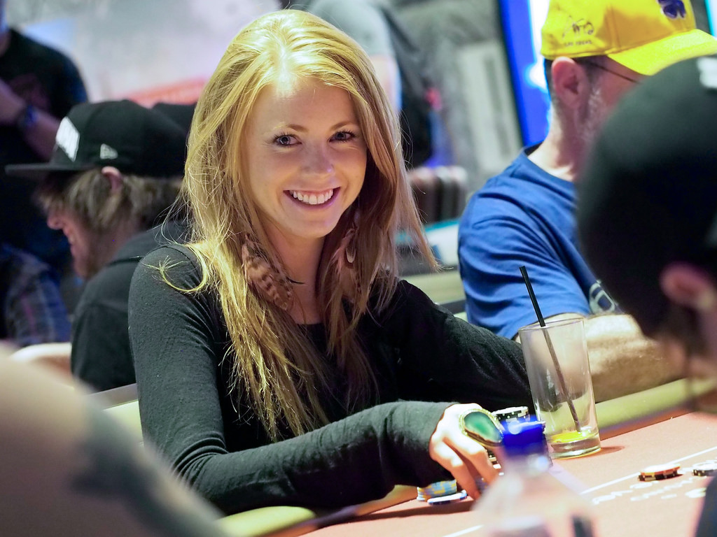 Description: A woman sitting at a table with a glass of beer in her hand and a man standing behind her.