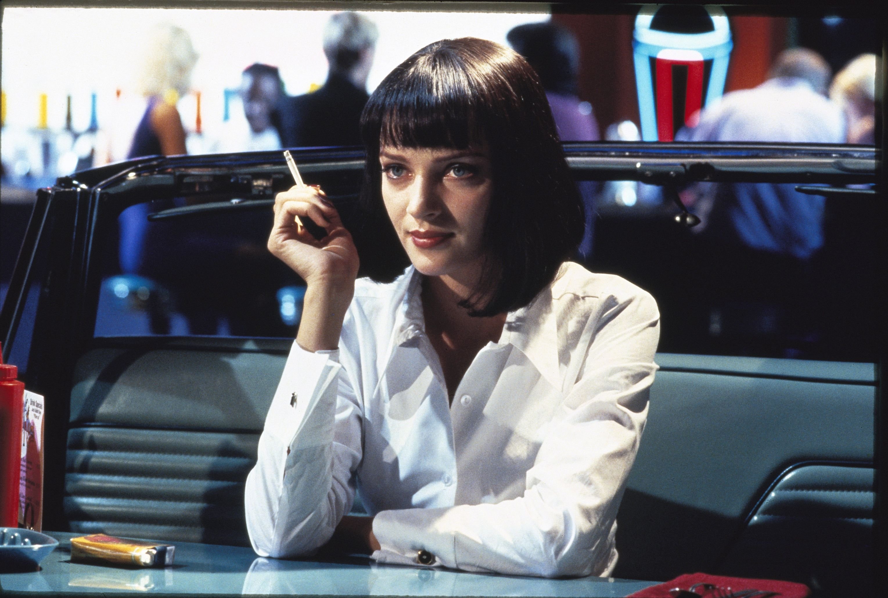 Description: A woman sitting at a table with a cigarette in her hand and a cigarette in her mouth.