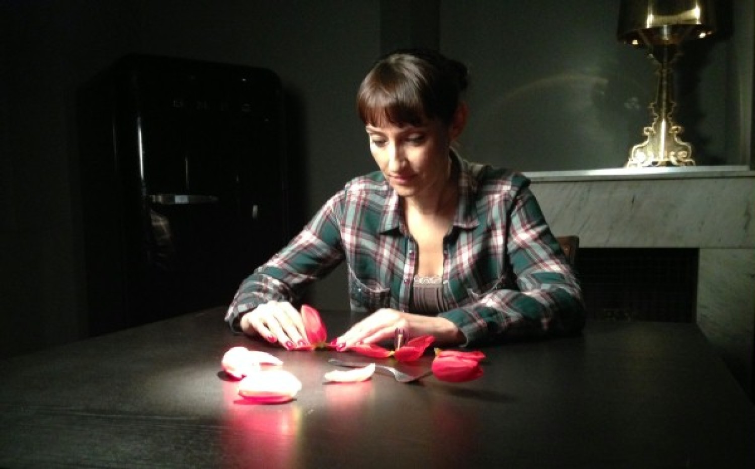 Description: A woman sitting at a table cutting paper with scissors and a knife in her hand.