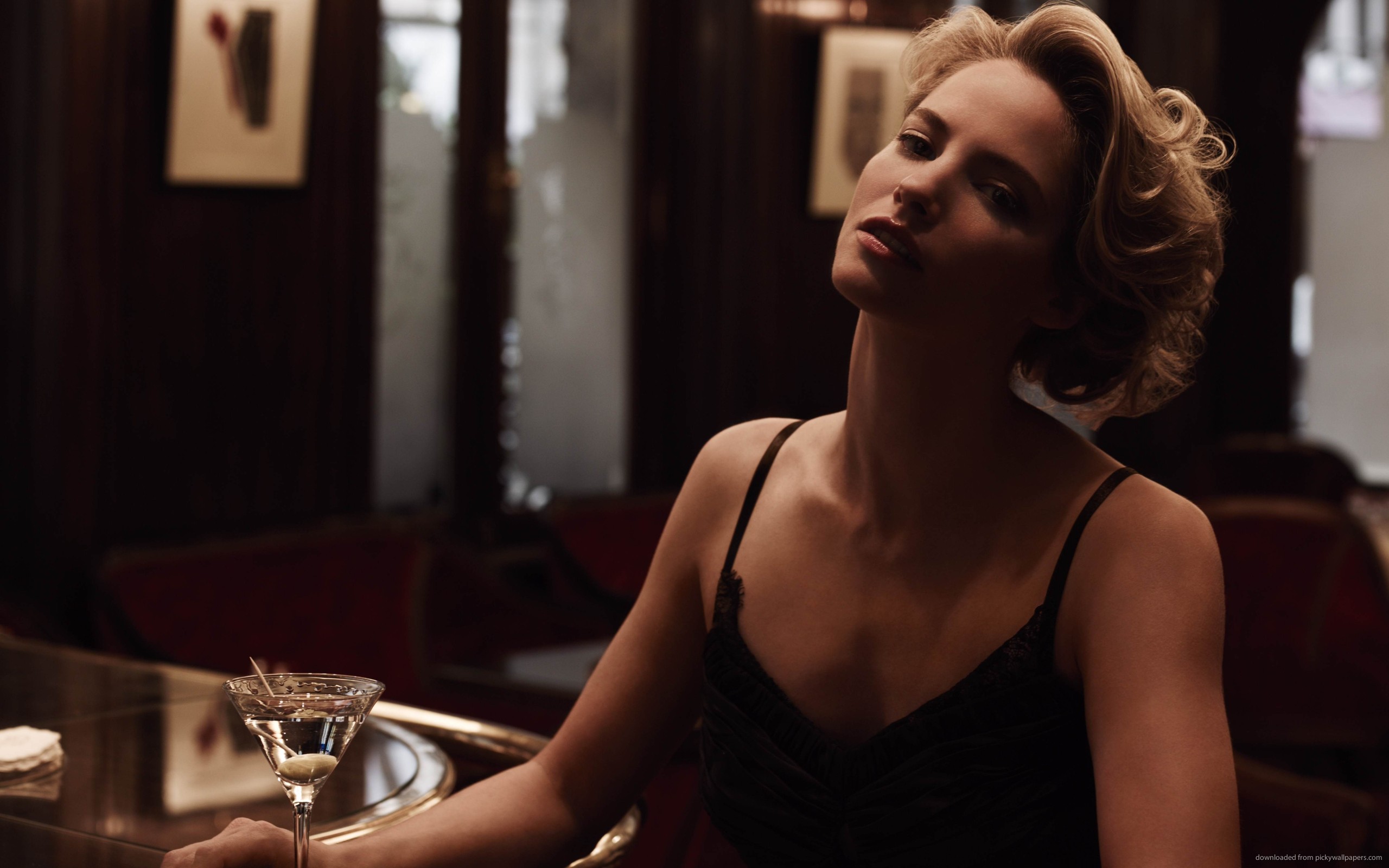 Description: A woman sitting at a table with a glass of wine in her hand and looking up at the sky.