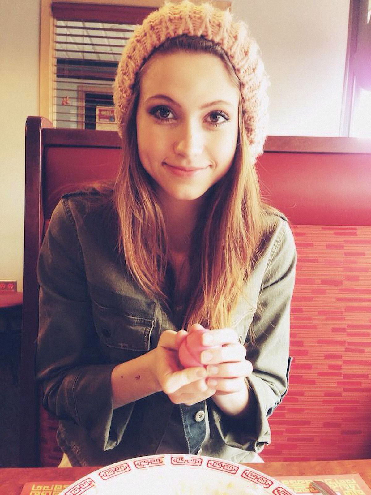 Description: A woman sitting at a table with a plate of food in front of her and a pizza on the table.