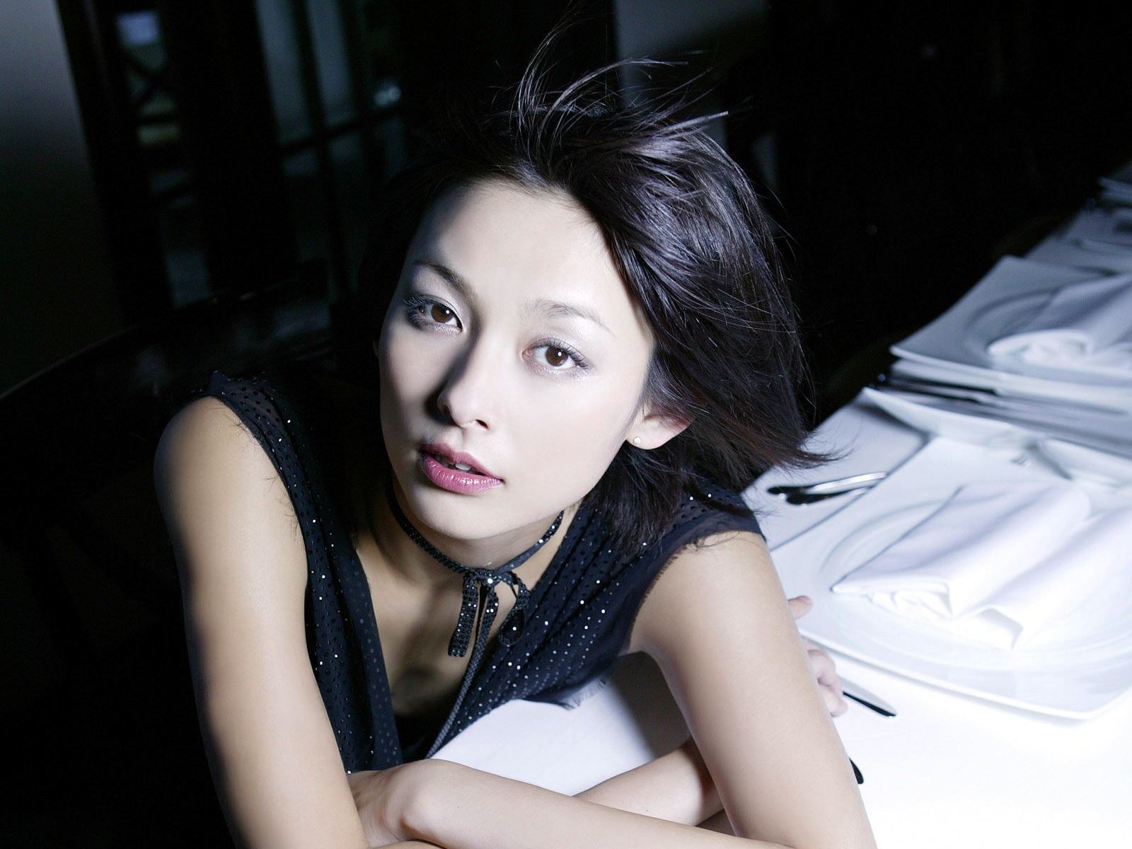 Description: A woman sitting on a table with a white table cloth on it and a white table cloth on the table.