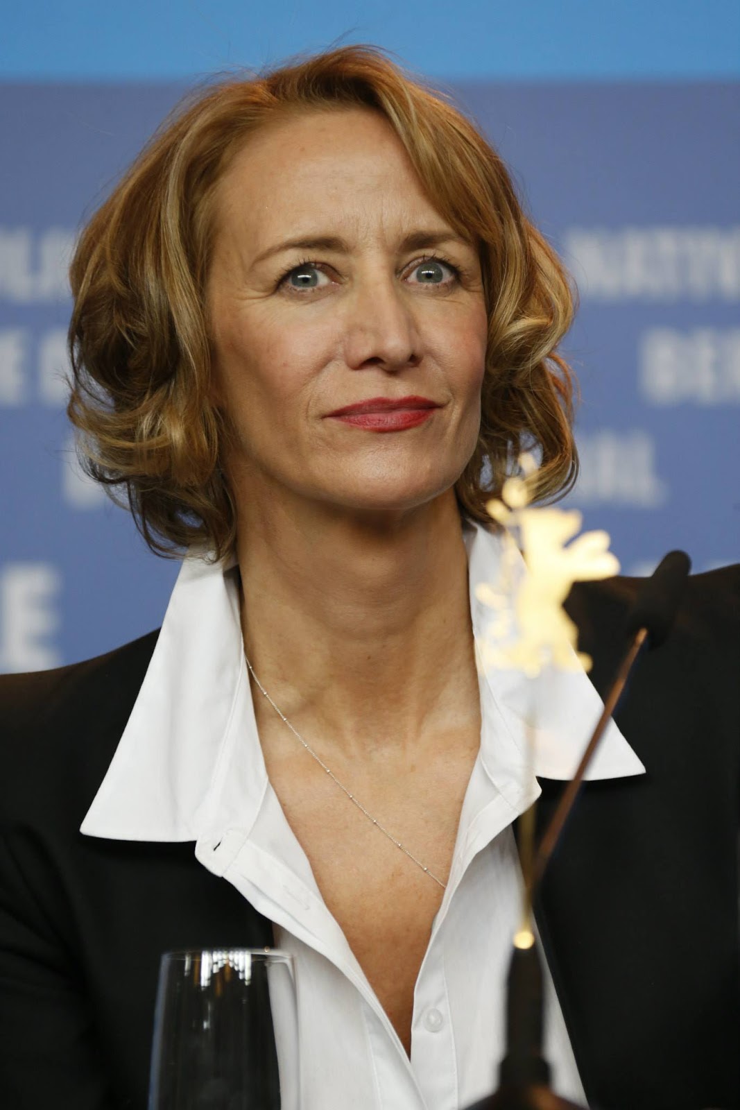 Description: A woman sitting at a table with a glass of wine in front of her and a microphone in front of her.