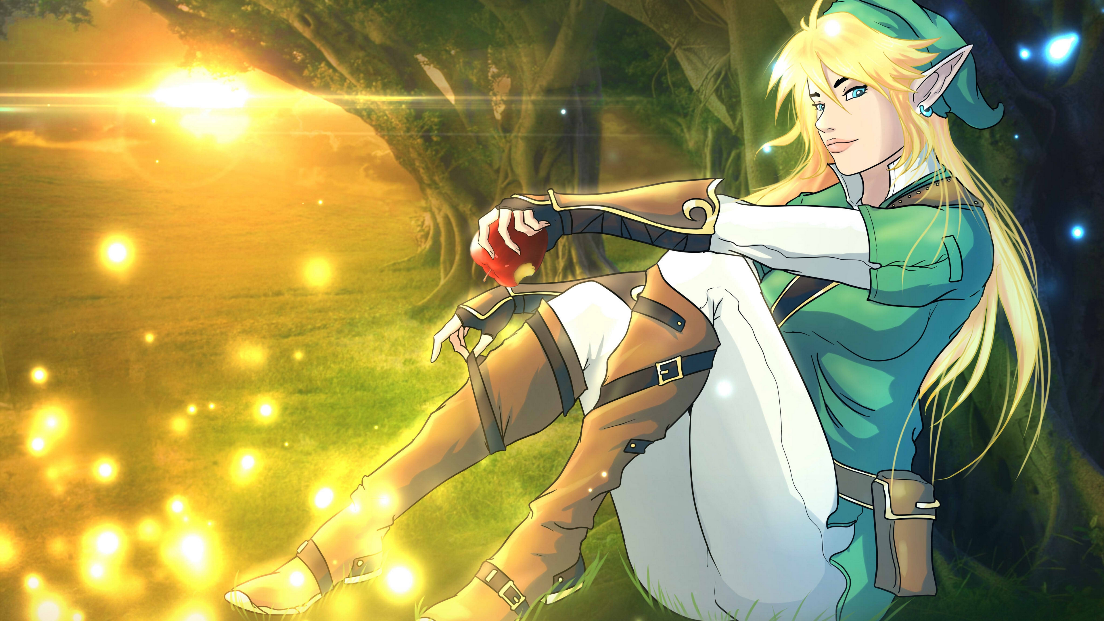 Description: A woman sitting on a tree in a forest with a sword in her hand and a glowing light shining behind her.