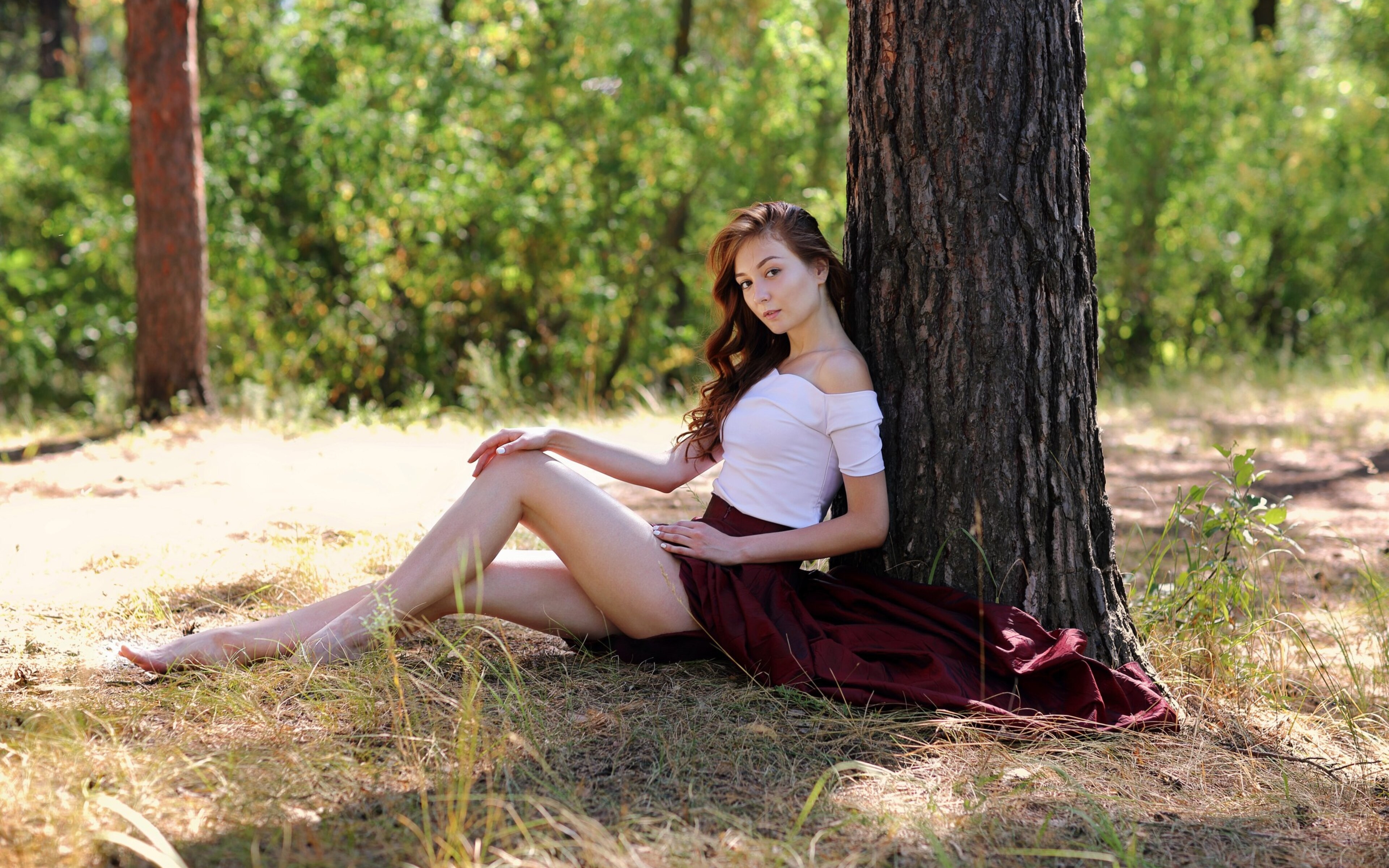 Description: A woman sitting under a tree in a forest wearing a skirt and heels with her legs crossed.