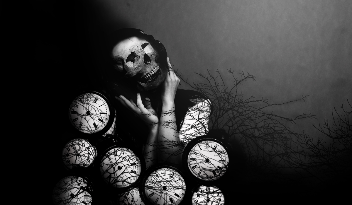 Description: A woman with a skeleton face and a bunch of clocks in front of her face.