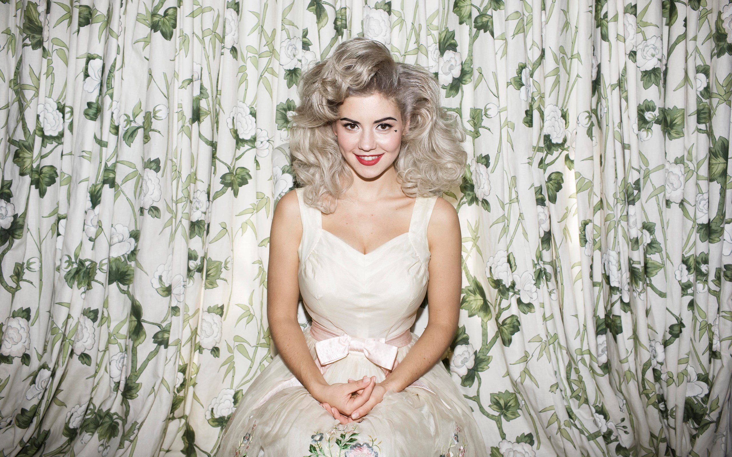 Description: A woman sitting on a chair in front of a curtain with a bow on it's head and a smile on her face.