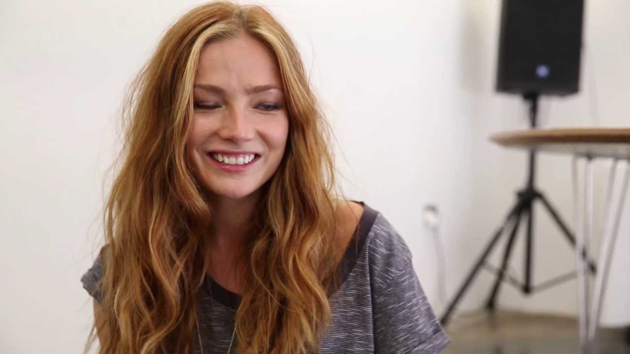 Description: A woman with long hair smiling and looking at the camera with a speaker in the background and a table with a chair.