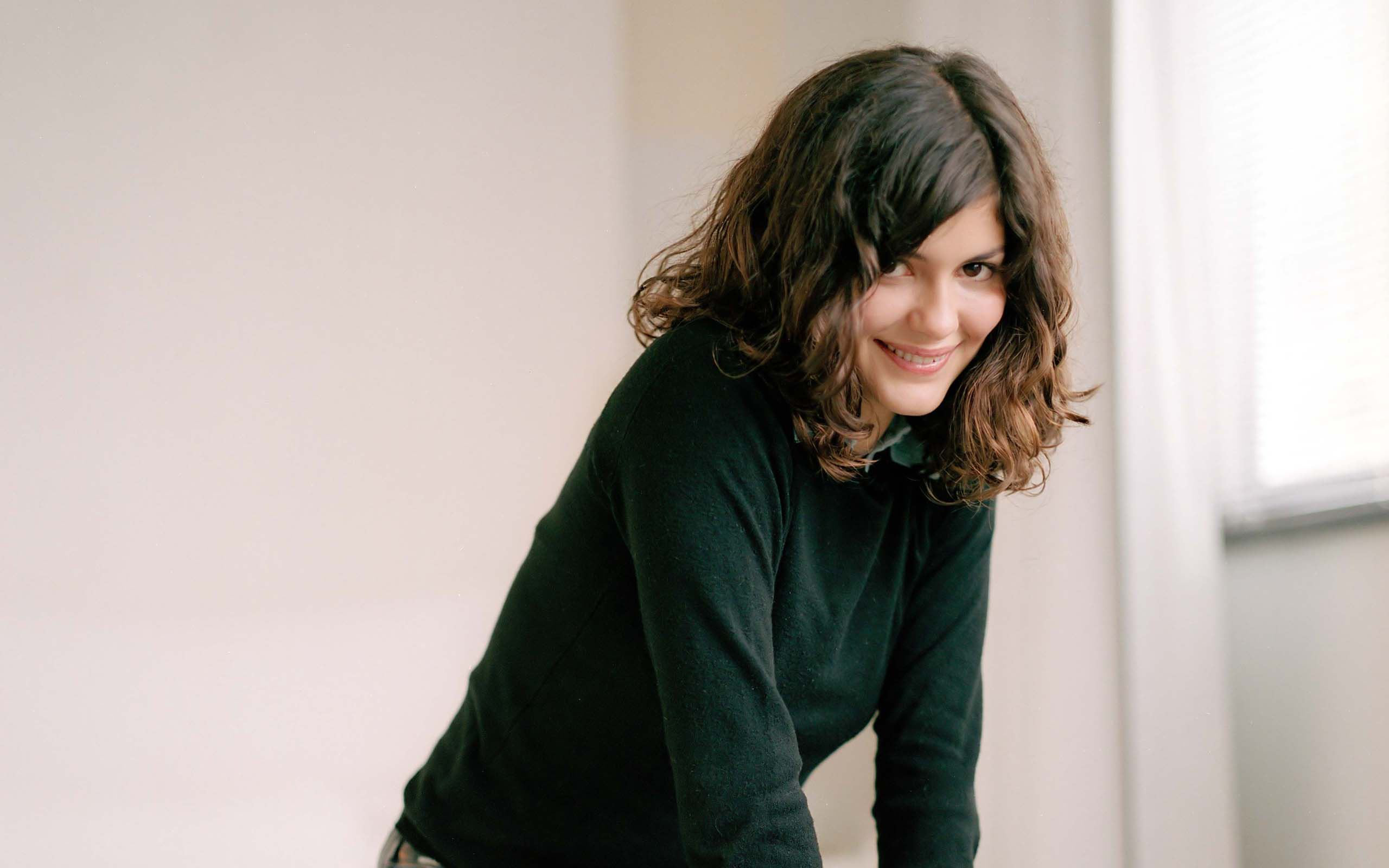 Description: A woman in a black shirt is smiling and leaning on a table with a laptop on it and a window behind her.