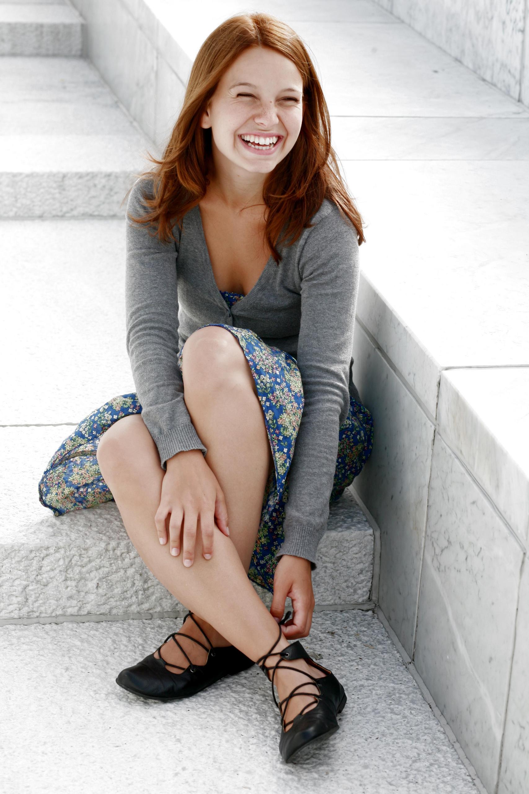 Description: A woman sitting on the steps smiling for the camera with her legs crossed and her shoes on the ground.