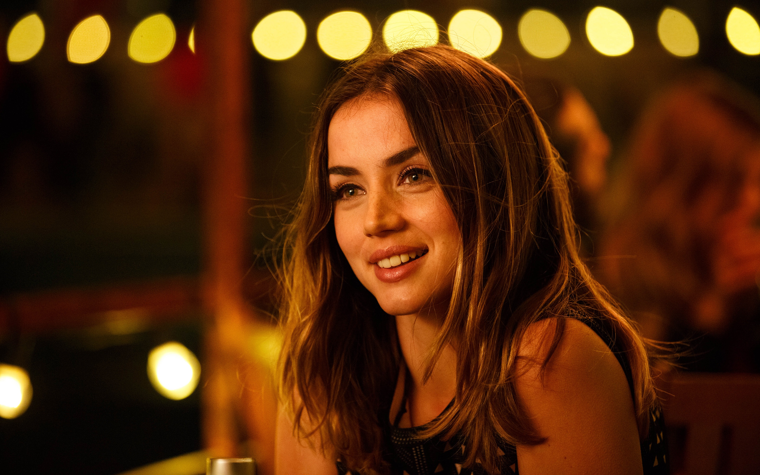 Description: A woman sitting at a table with a glass of wine in front of her smiling at the camera with lights in the background.