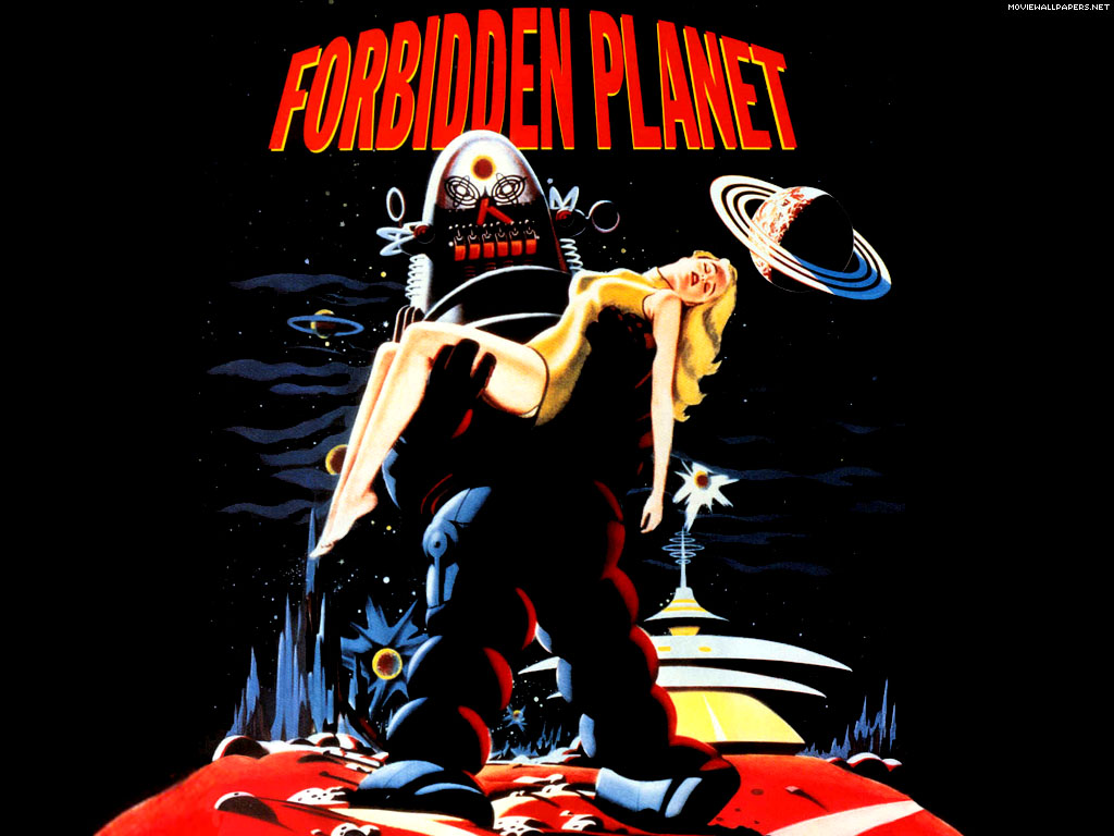 Description: A poster of a woman in a space suit and a robot in the background with a planet in the background.