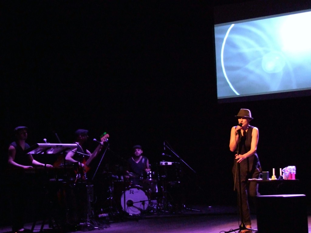 Description: A woman standing on a stage with a microphone in her hand and a band behind her on a screen.