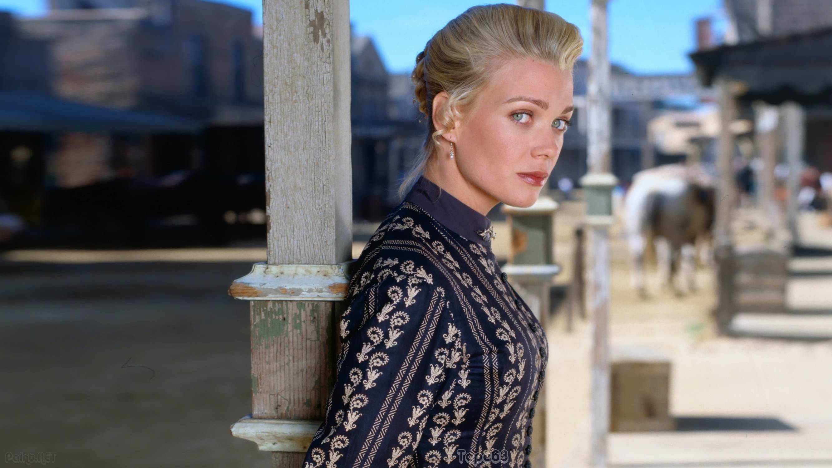 Description: A woman standing next to a pole on a street corner with horses in the background and a building in the background.