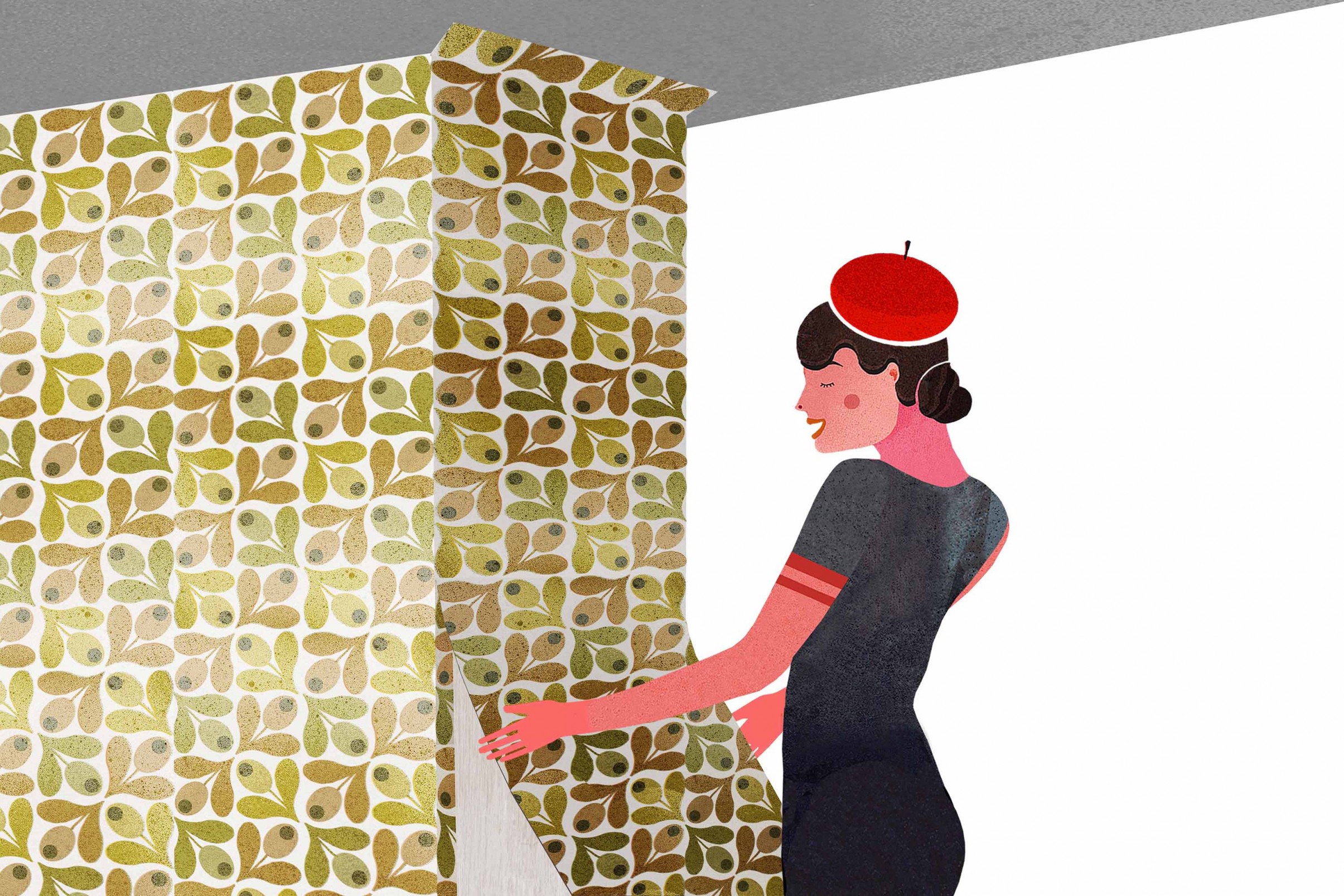 Description: A woman is standing next to a wall with a red apple on it's head and a green wall behind her.