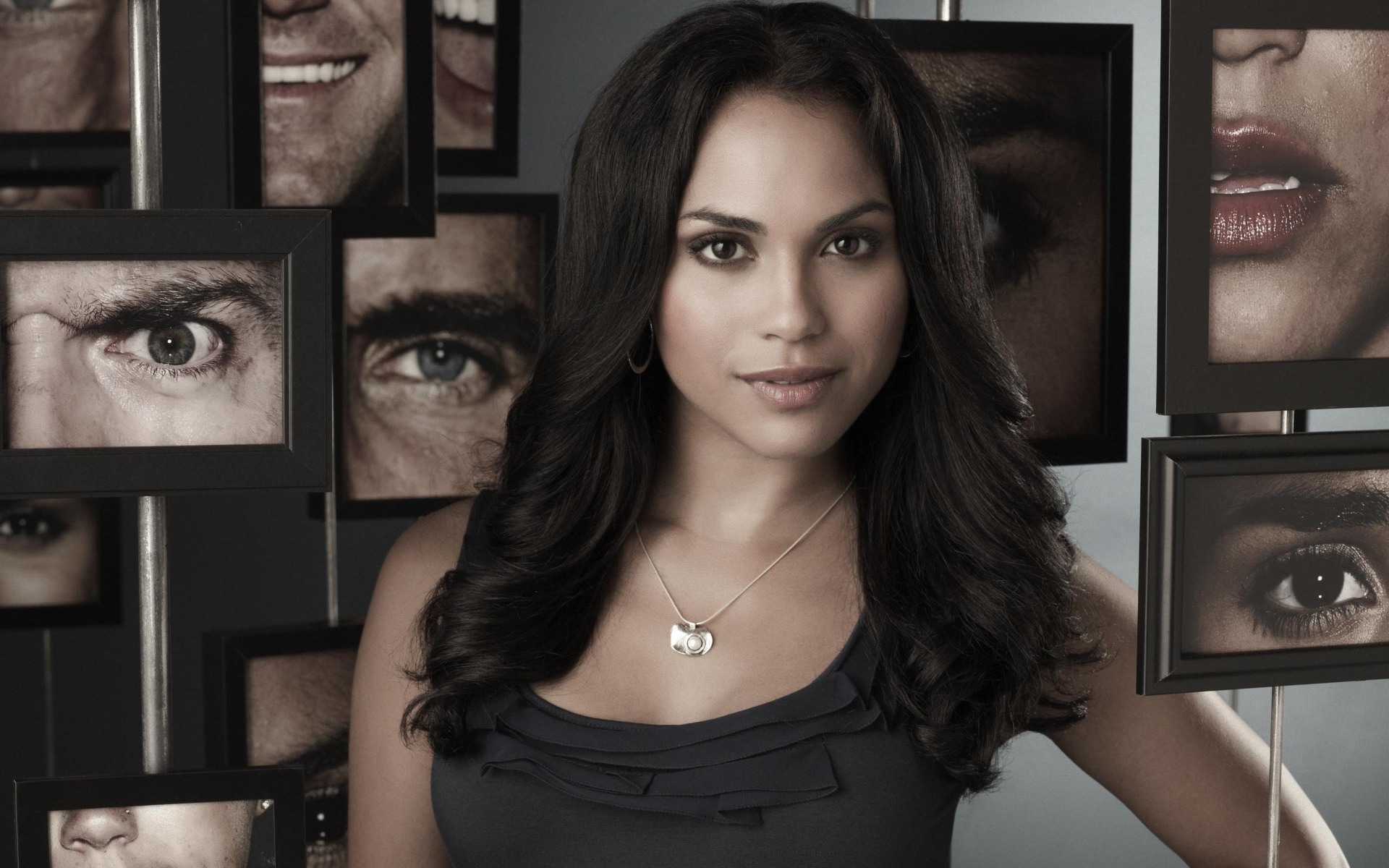 Description: A woman standing in front of a wall of pictures with eyes on them and a necklace on her neck.