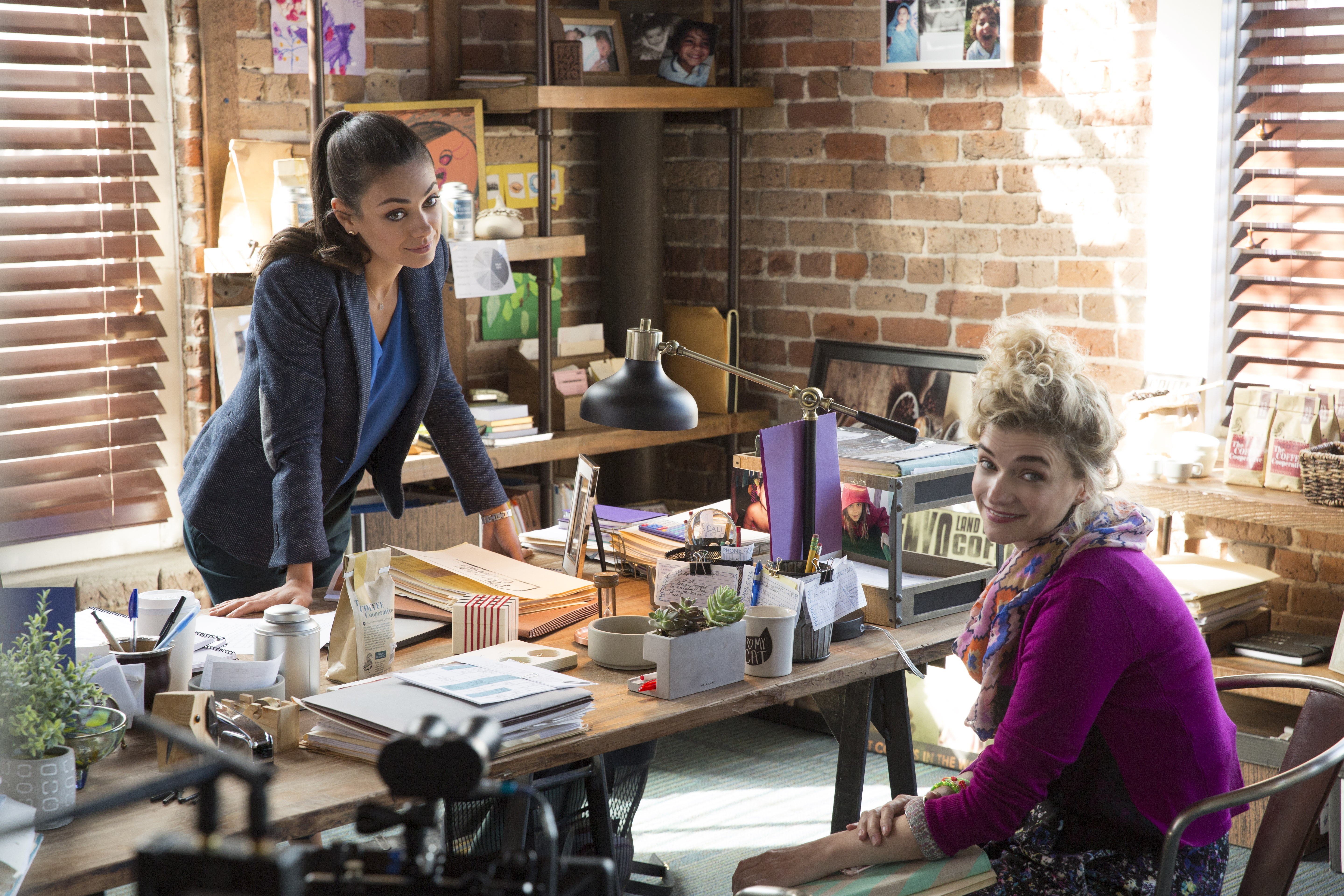 Description: A woman standing next to a woman sitting at a table in a room with a brick wall and a window.