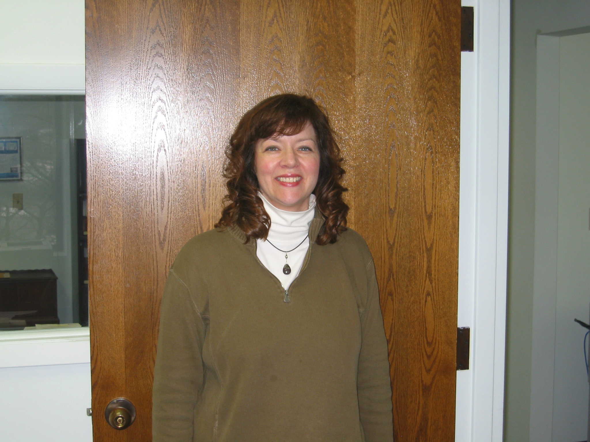 Description: A woman standing in front of a wooden door with a white shirt on and a necklace on her neck.