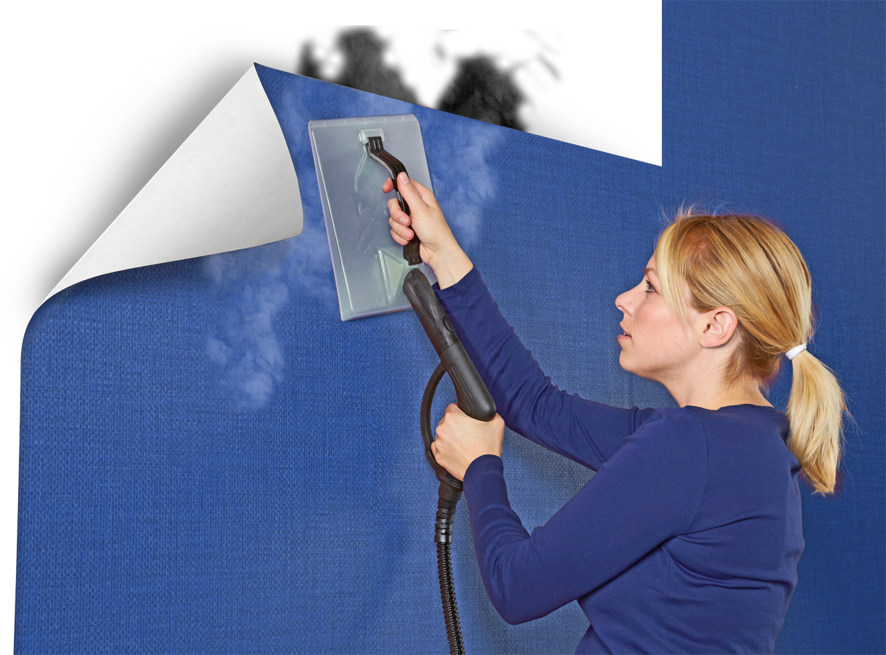 Description: A woman is using a steam wand to clean a wall with a blue background and a white background behind her.