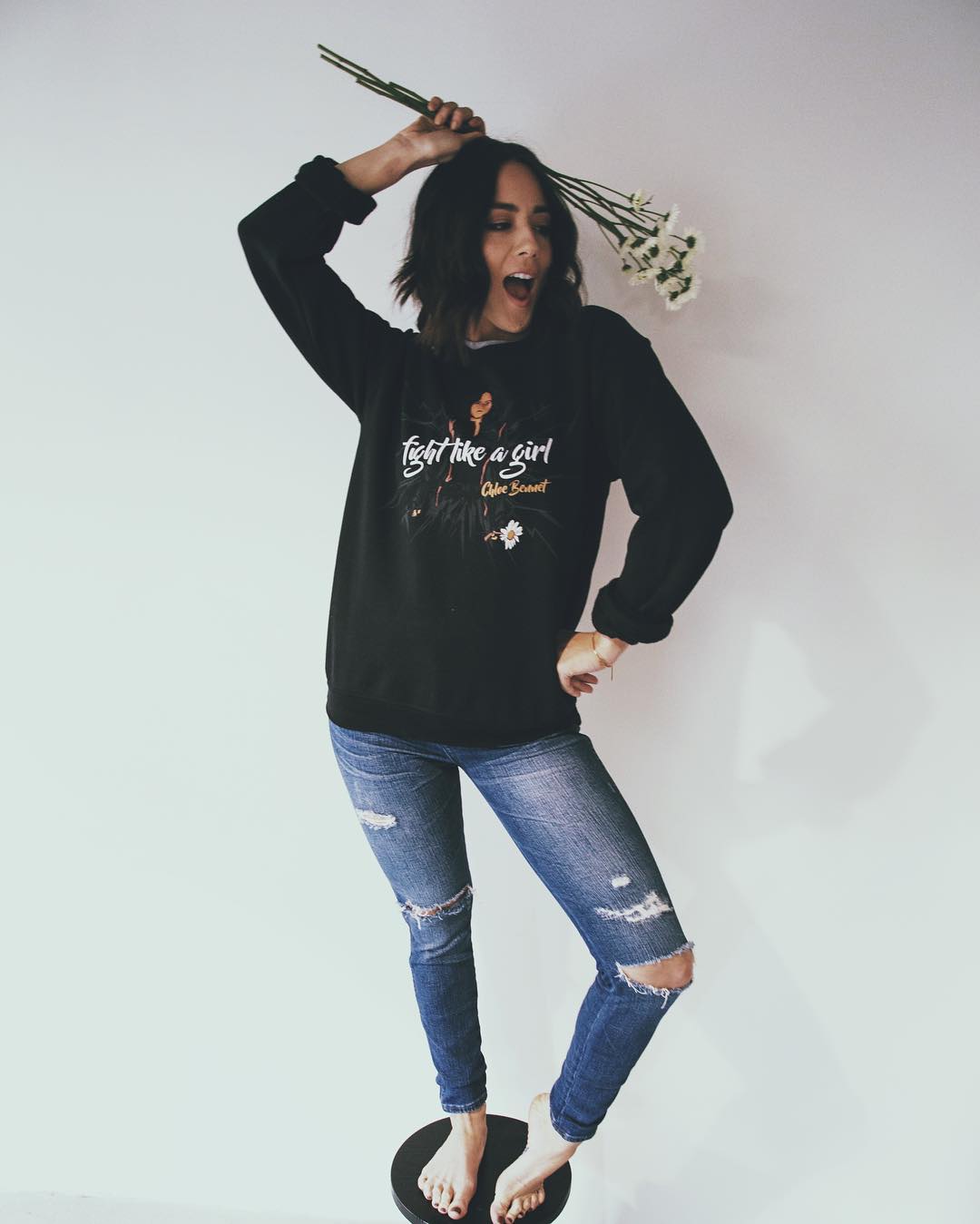 Description: A woman standing on a stool holding a pair of scissors over her head and a flower in her hair.