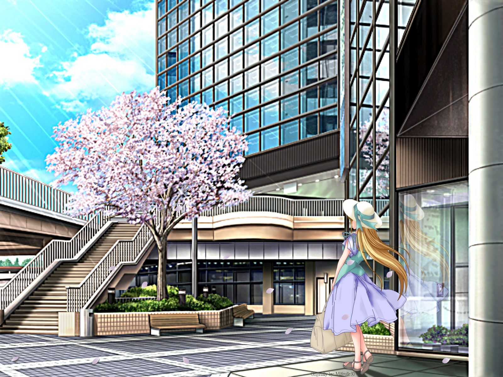 Description: A woman walking down a street next to a tall building with a tree in the background and a sky background.
