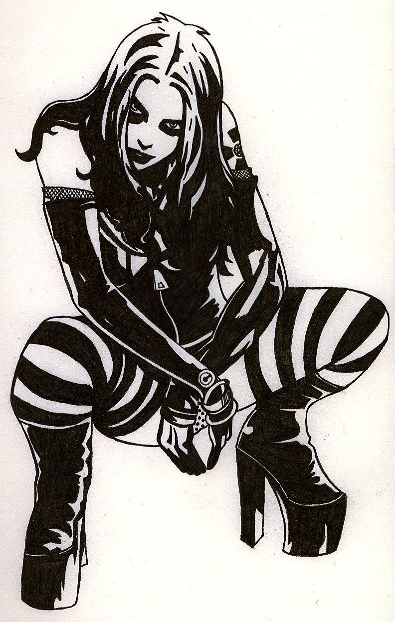 Description: A drawing of a woman in a striped outfit kneeling down with a sword in her hand and a striped skirt on her knees.